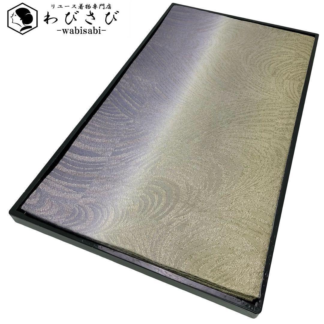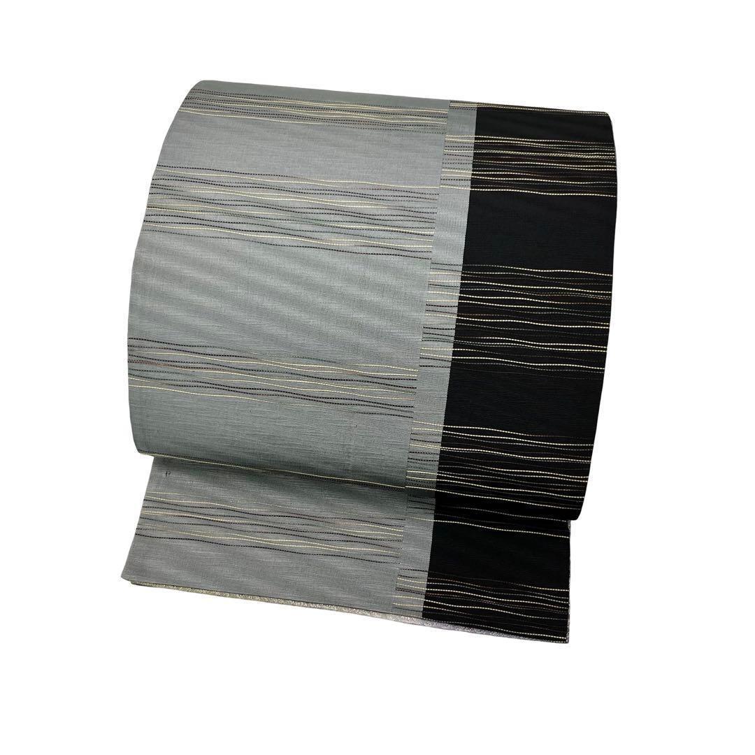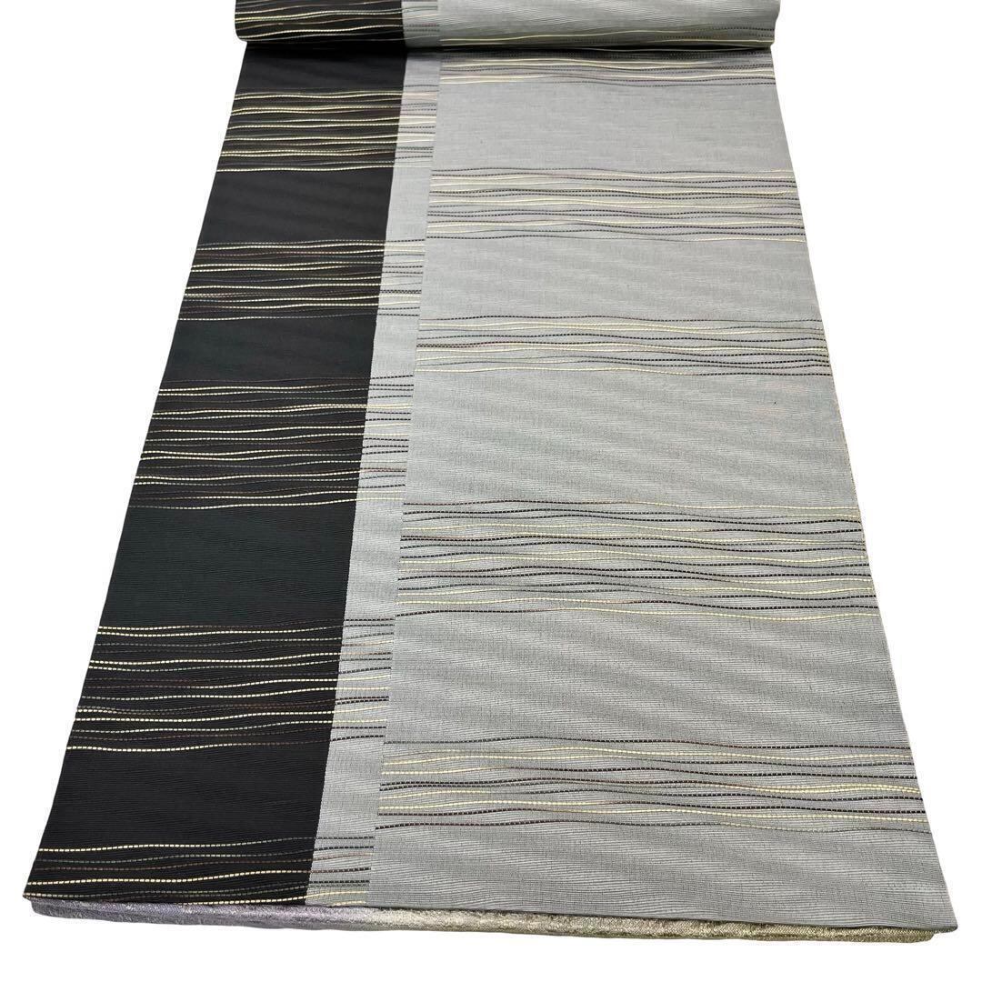 利休色ベースの色味の良い暈しに縦柄のグラデーションに織模様、反対はモノトーンベースに金糸が使われたモダンな柄裄の両面使える素敵なお品でございます。