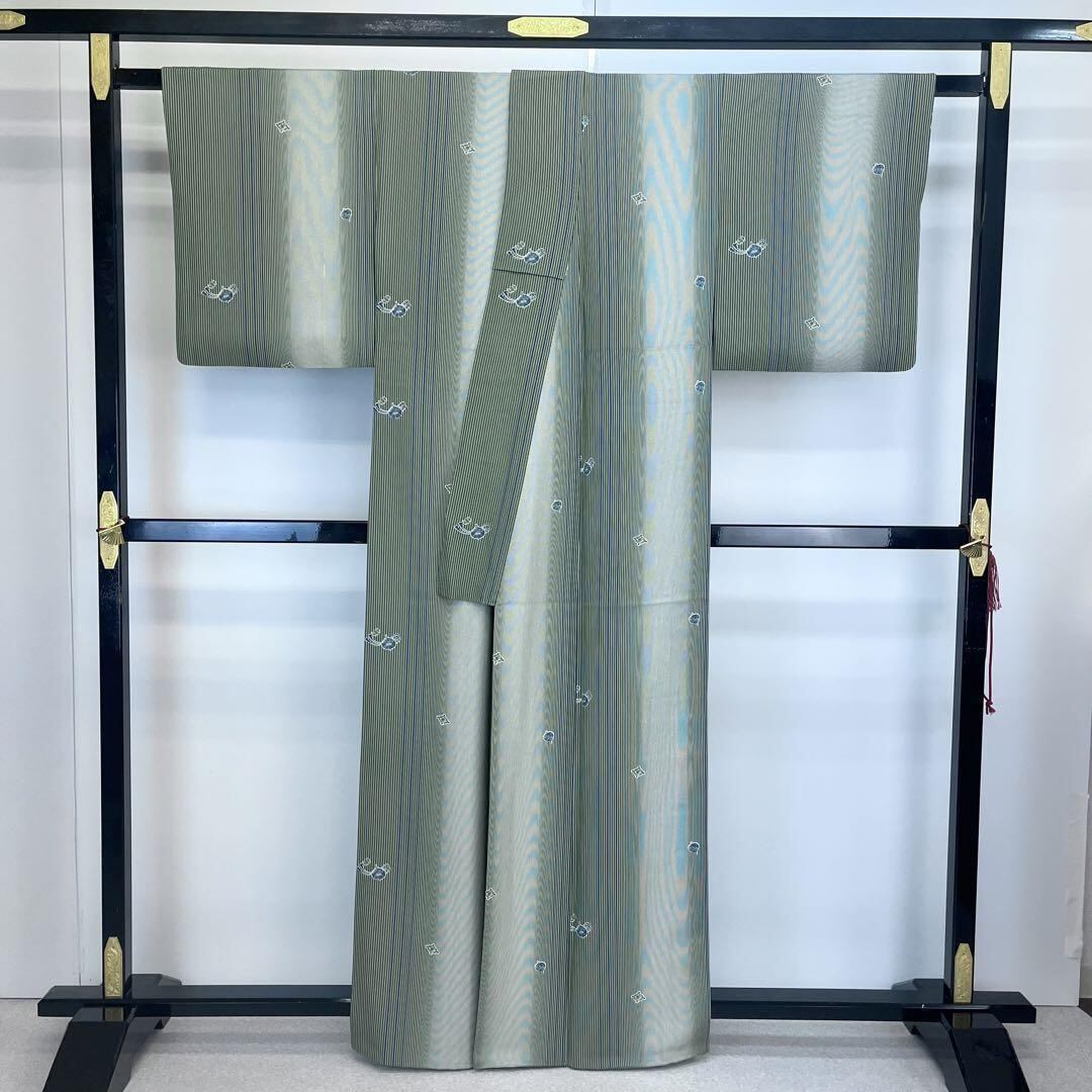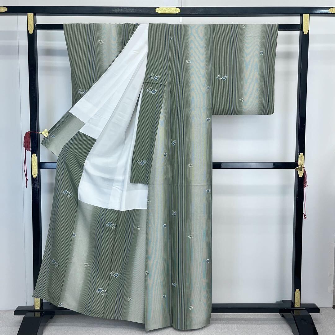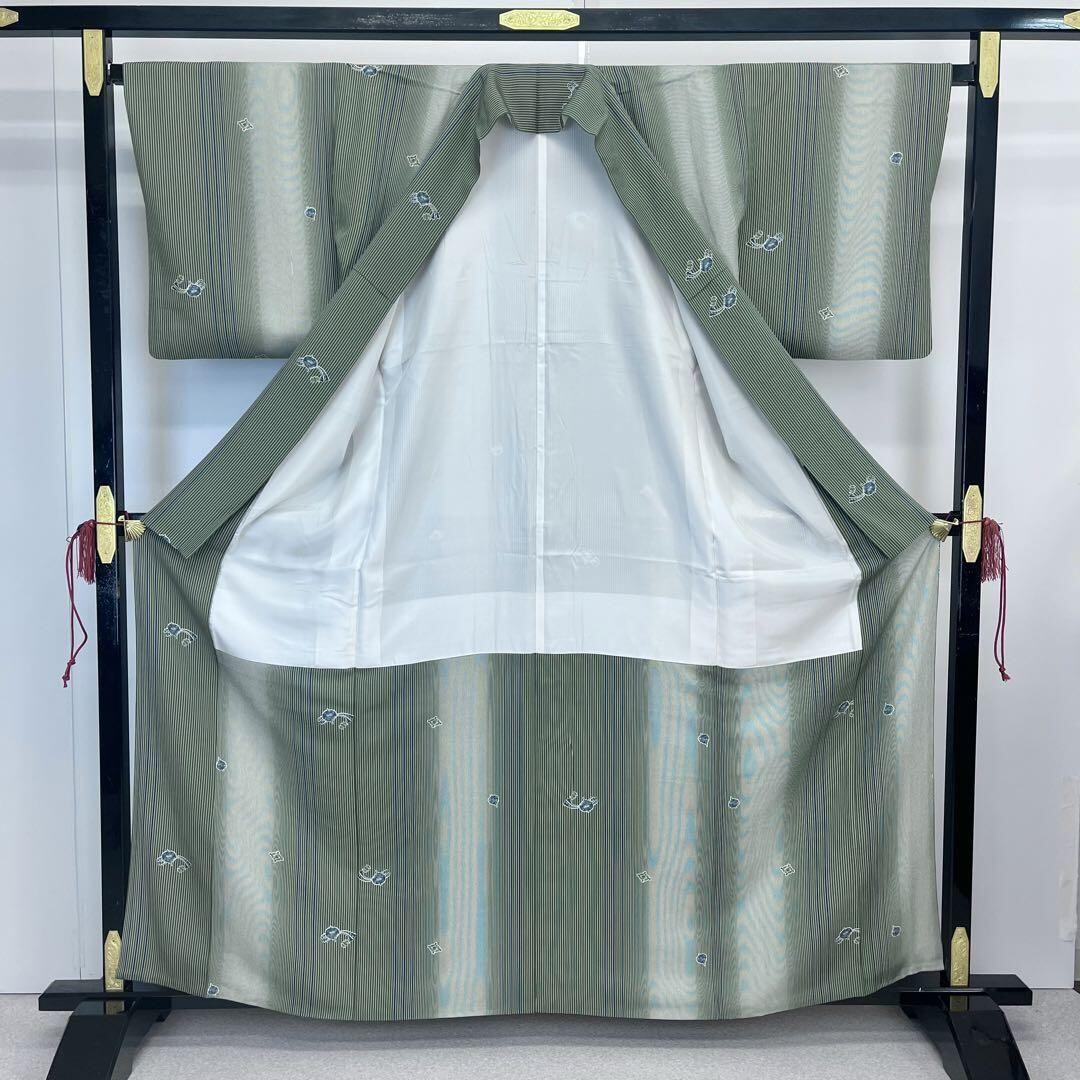 海松色ベースの縮緬にグラデーション、縦縞模様に飛び柄の駒などの柄裄が素敵なお品でございます。
