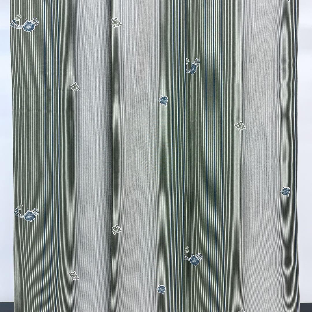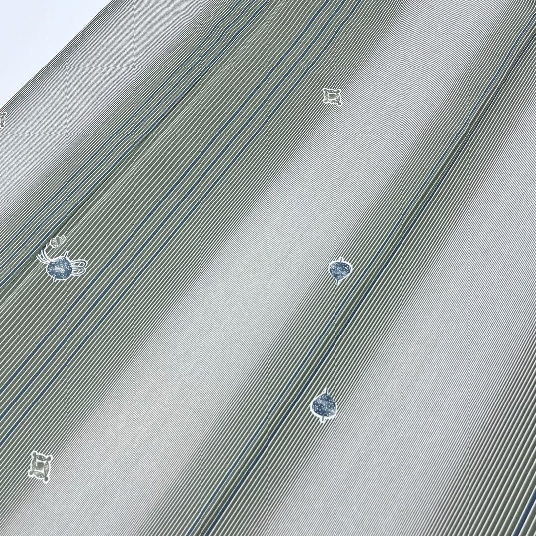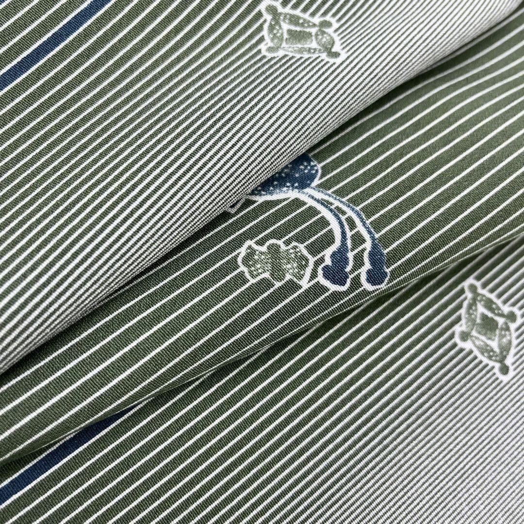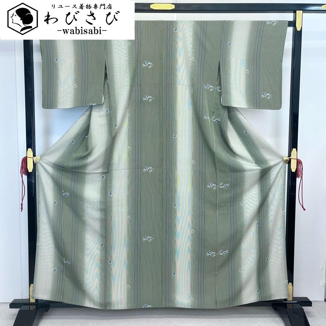 海松色ベースの縮緬にグラデーション、縦縞模様に飛び柄の駒などの柄裄が素敵なお品でございます。