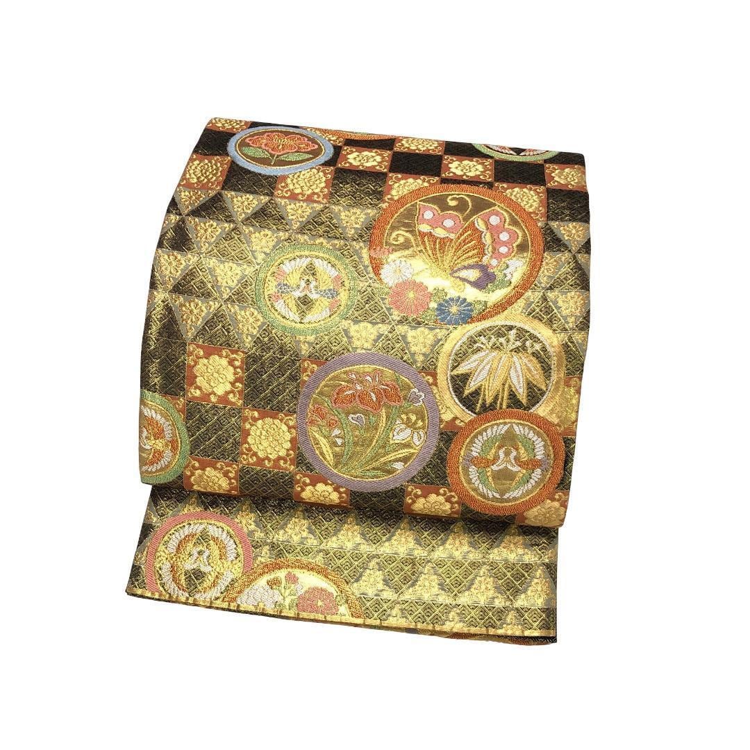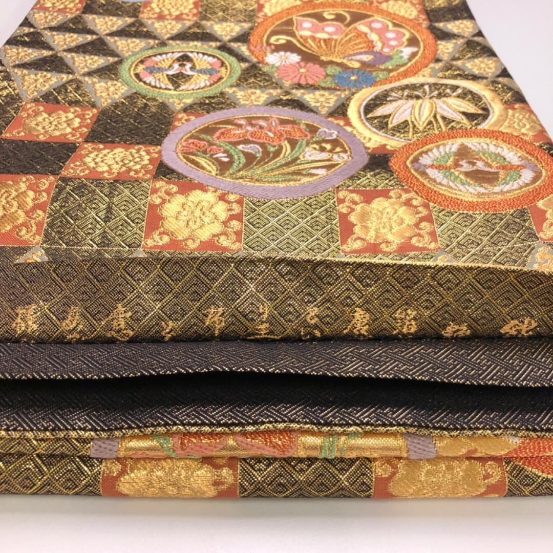 金色ベースのお色味に丸に蝶々、向かい鳥、花草模様などの柄行がデザインされた煌びやかなお品でございます。