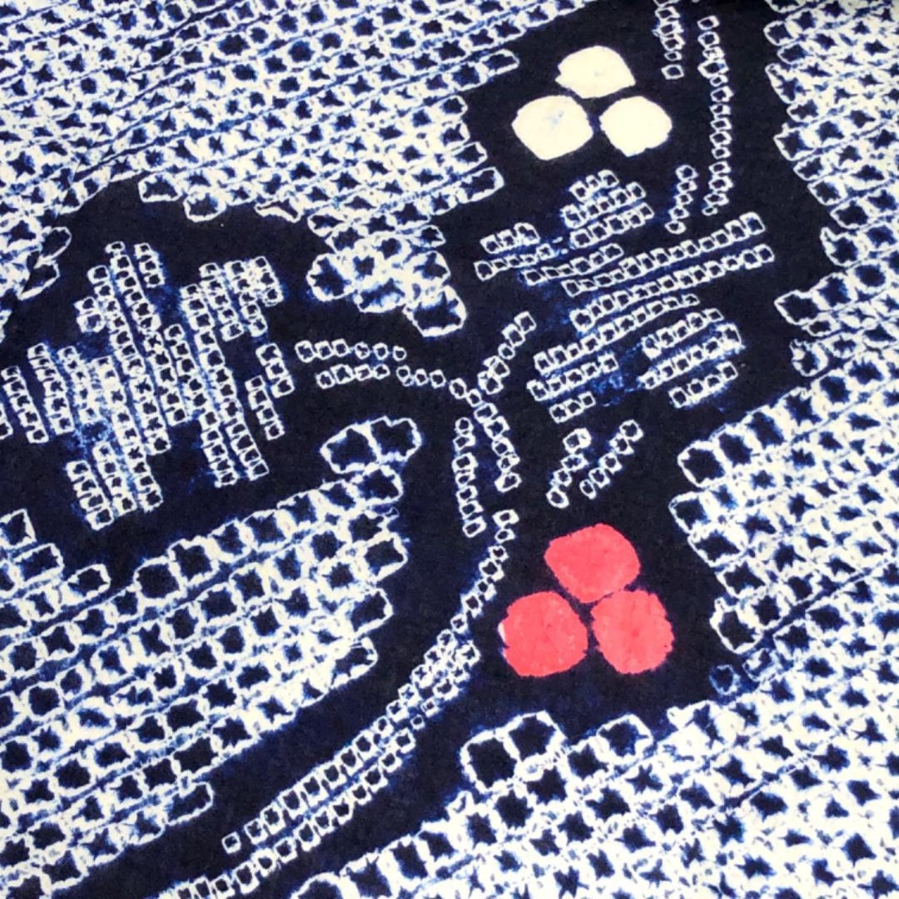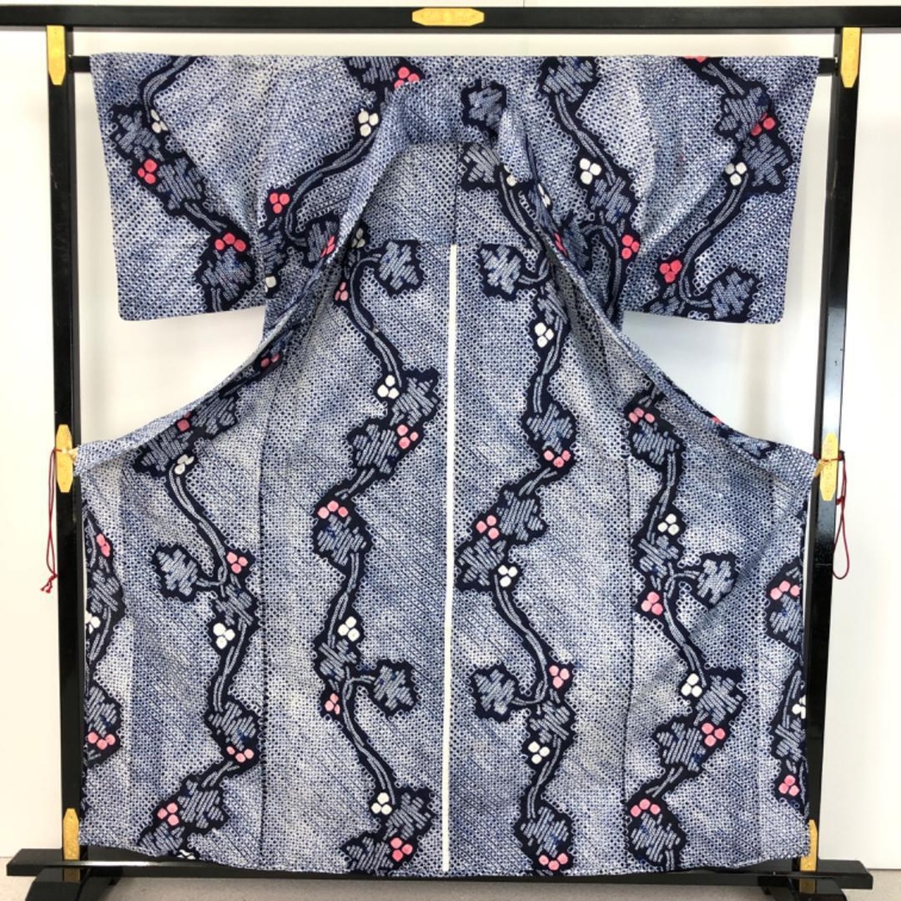 紺色のお色味に縦縞に葉模様がデザインされた素敵な柄裄のお品でございます。
