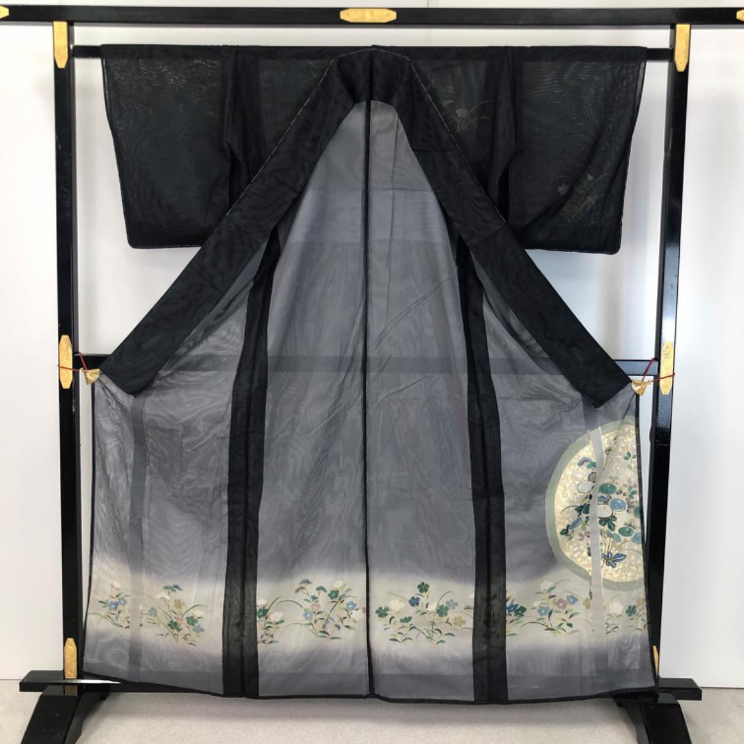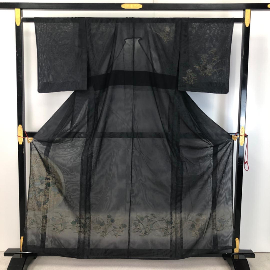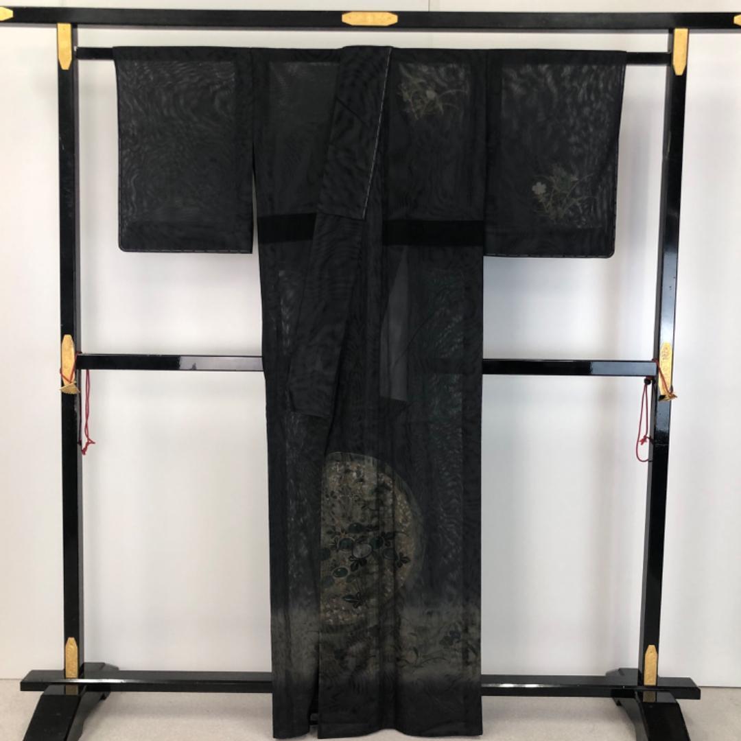 透け感のある黒色ベースのお色味、桔梗や万寿菊の柄裄が透けて浮かび上がる上品な柄行がデザインされた素敵なセットのお品でございます。