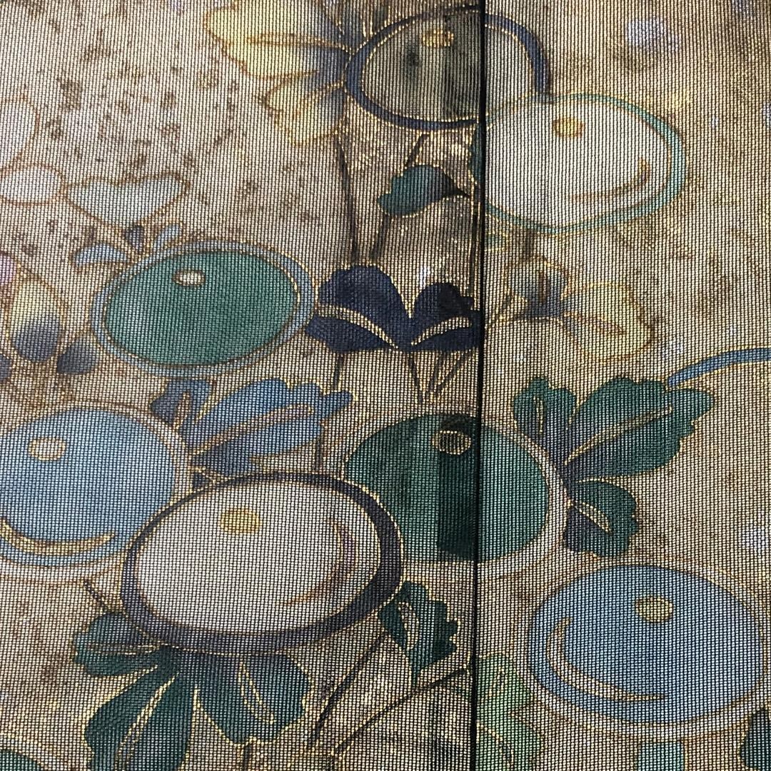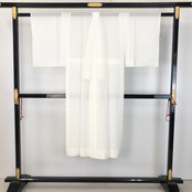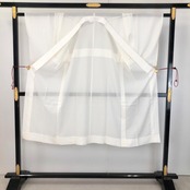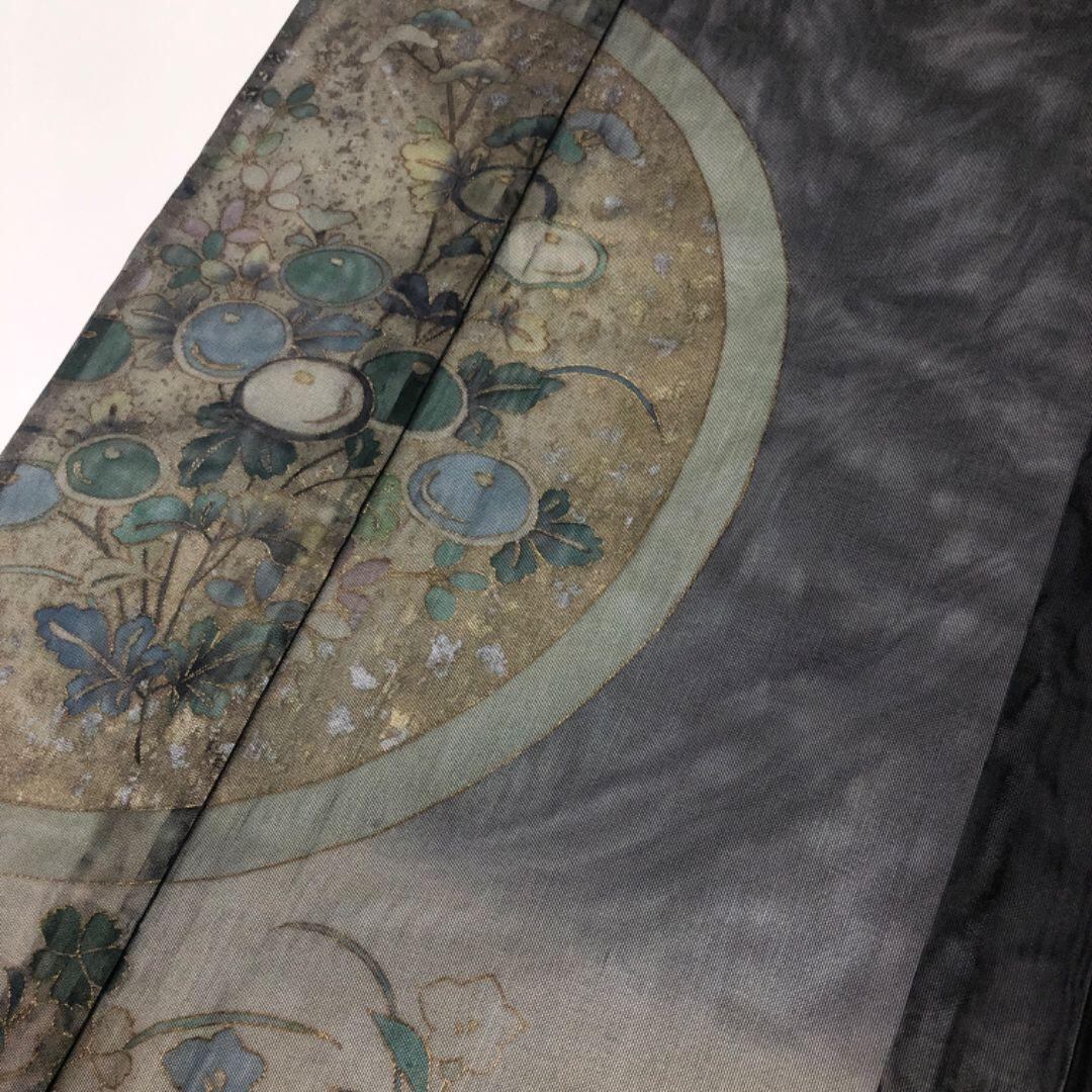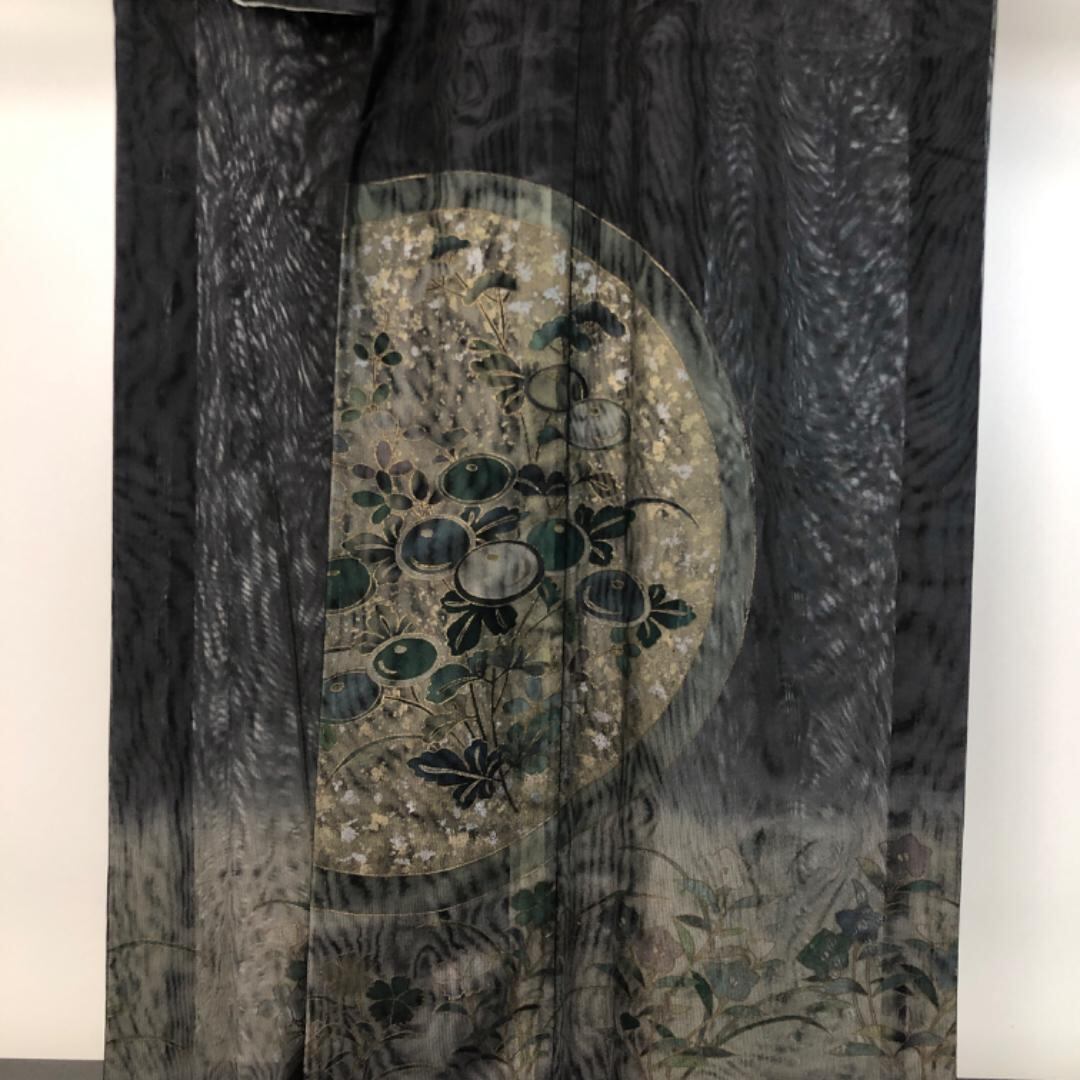 透け感のある黒色ベースのお色味、桔梗や万寿菊の柄裄が透けて浮かび上がる上品な柄行がデザインされた素敵なセットのお品でございます。