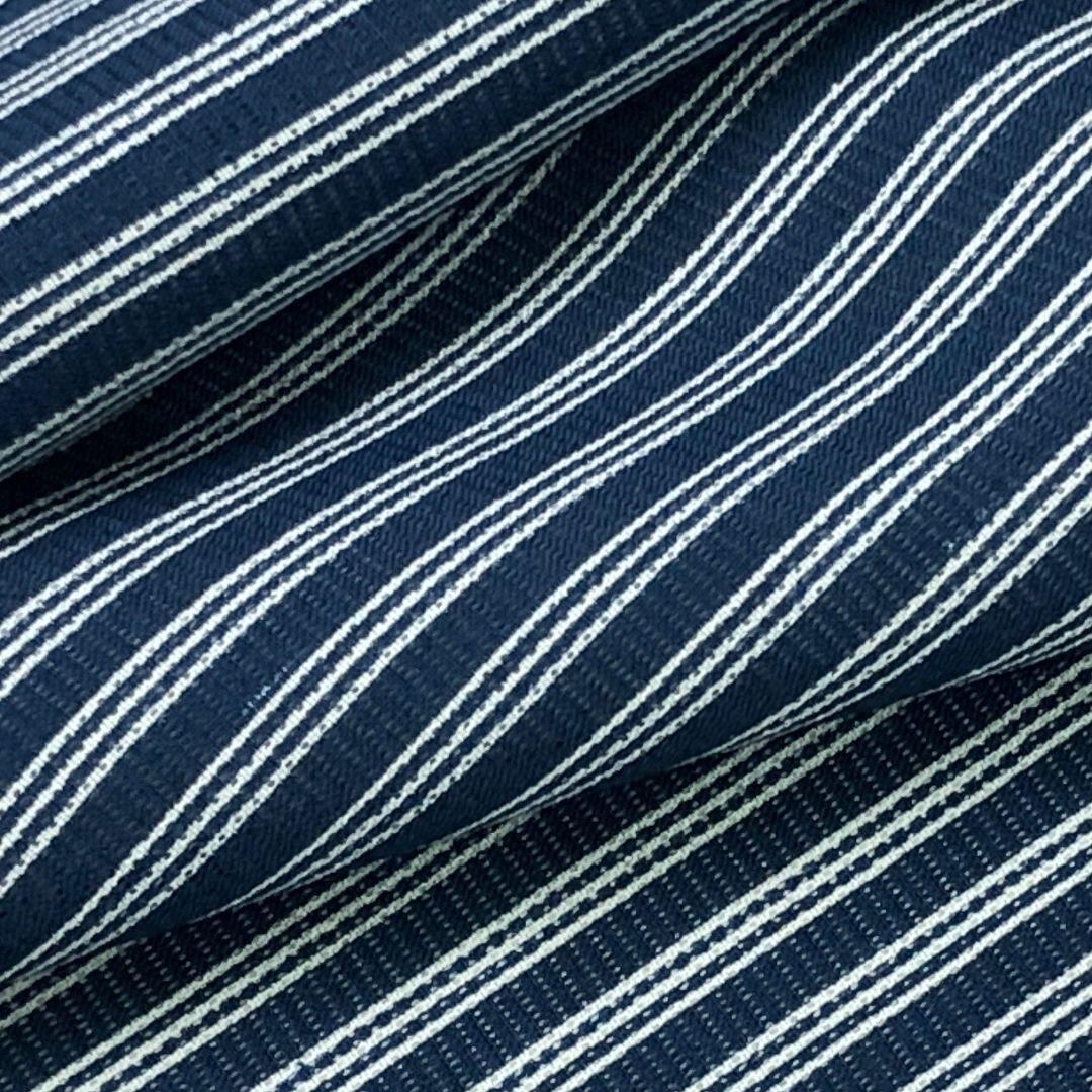 紺藍色の青系のお色味に縦縞模様がデザインされた涼しげで素敵なお品でございます。