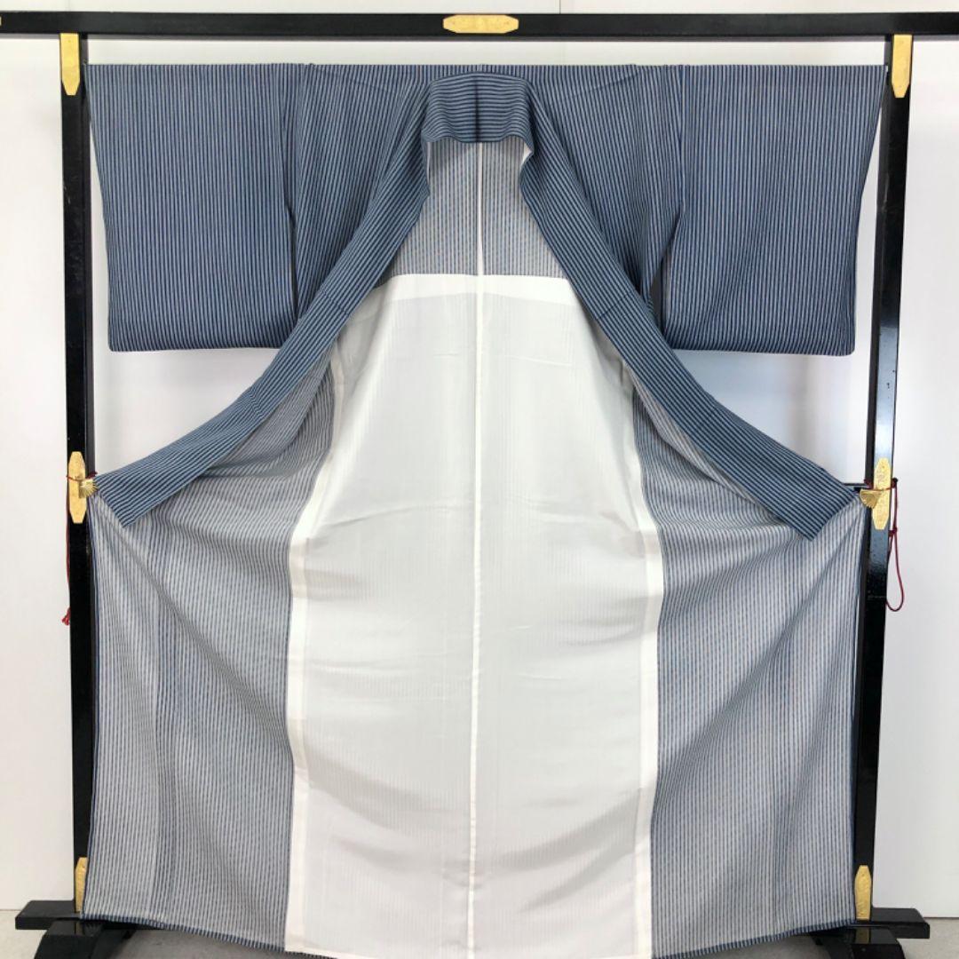 夏着物 小紋 絽 縦縞模様 紺藍色 トールサイズ K-5087 着物 きもの kimono 和服 和装 中古 リサイクル着物 【送料無料】