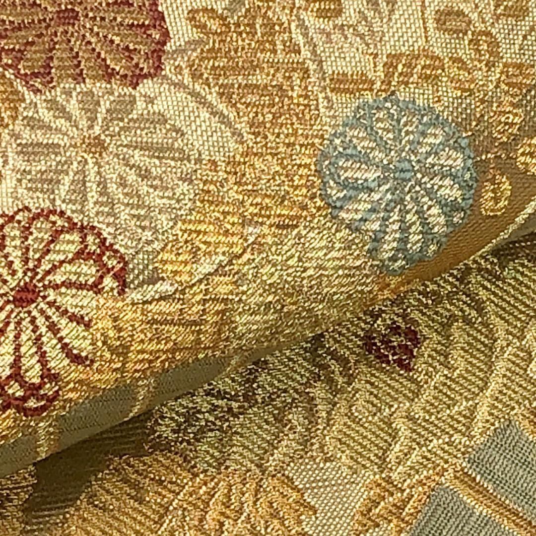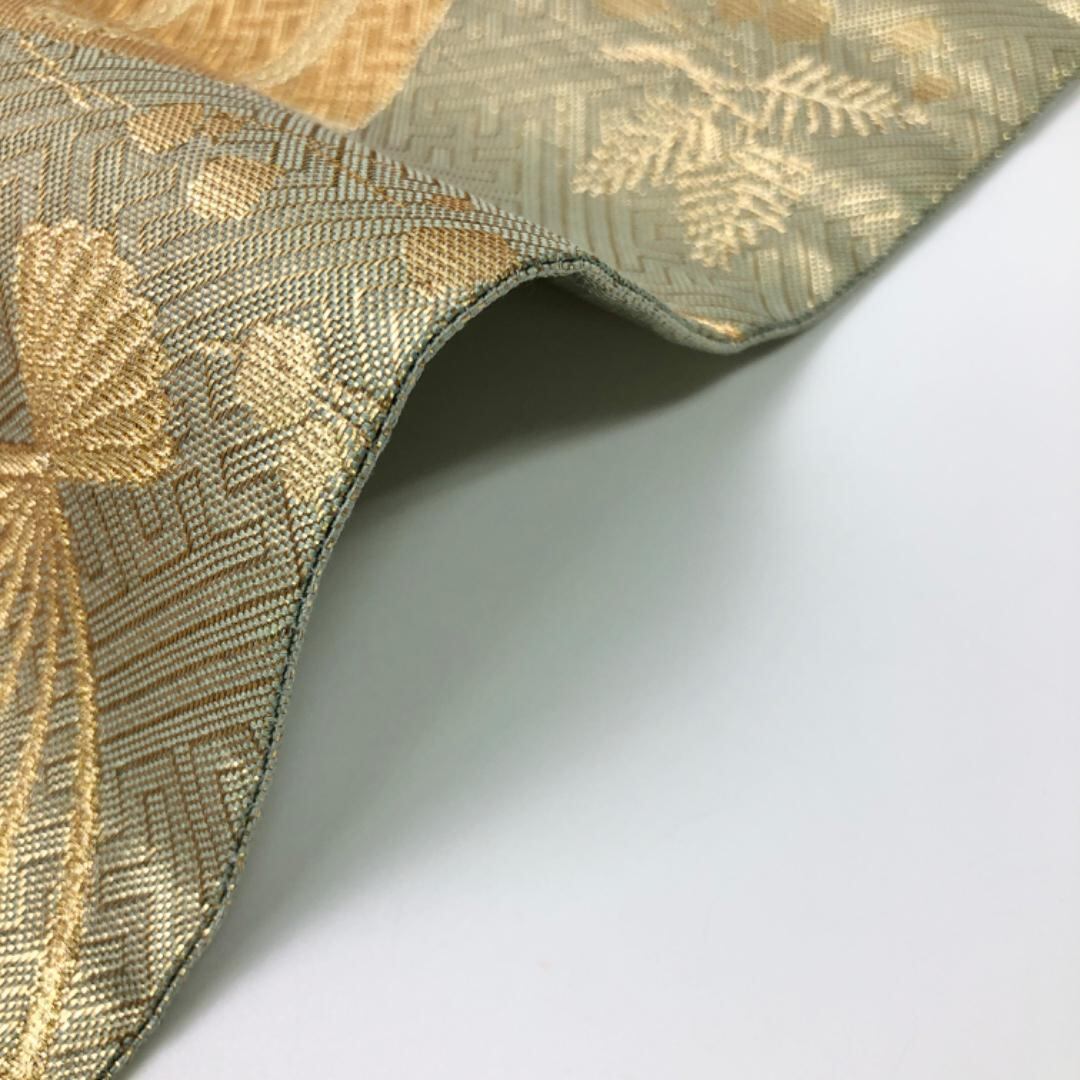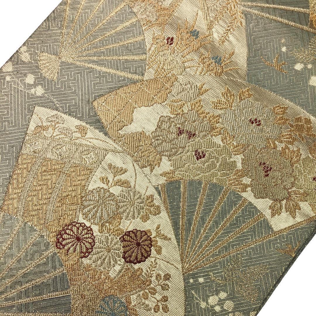 薄青磁色のお色味に紗綾型模様、扇子に花柄模様の柄裄がデザインされた素敵なお品でございます。