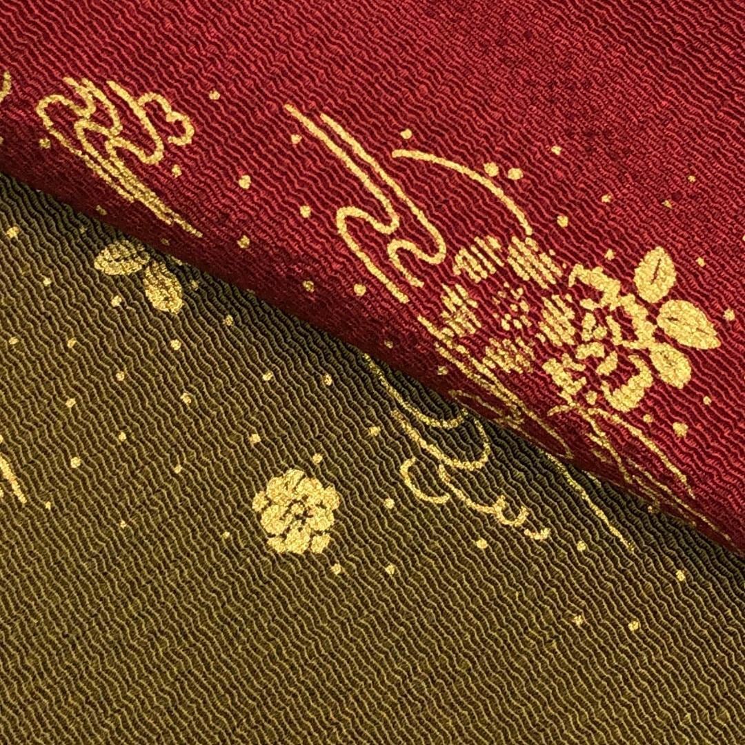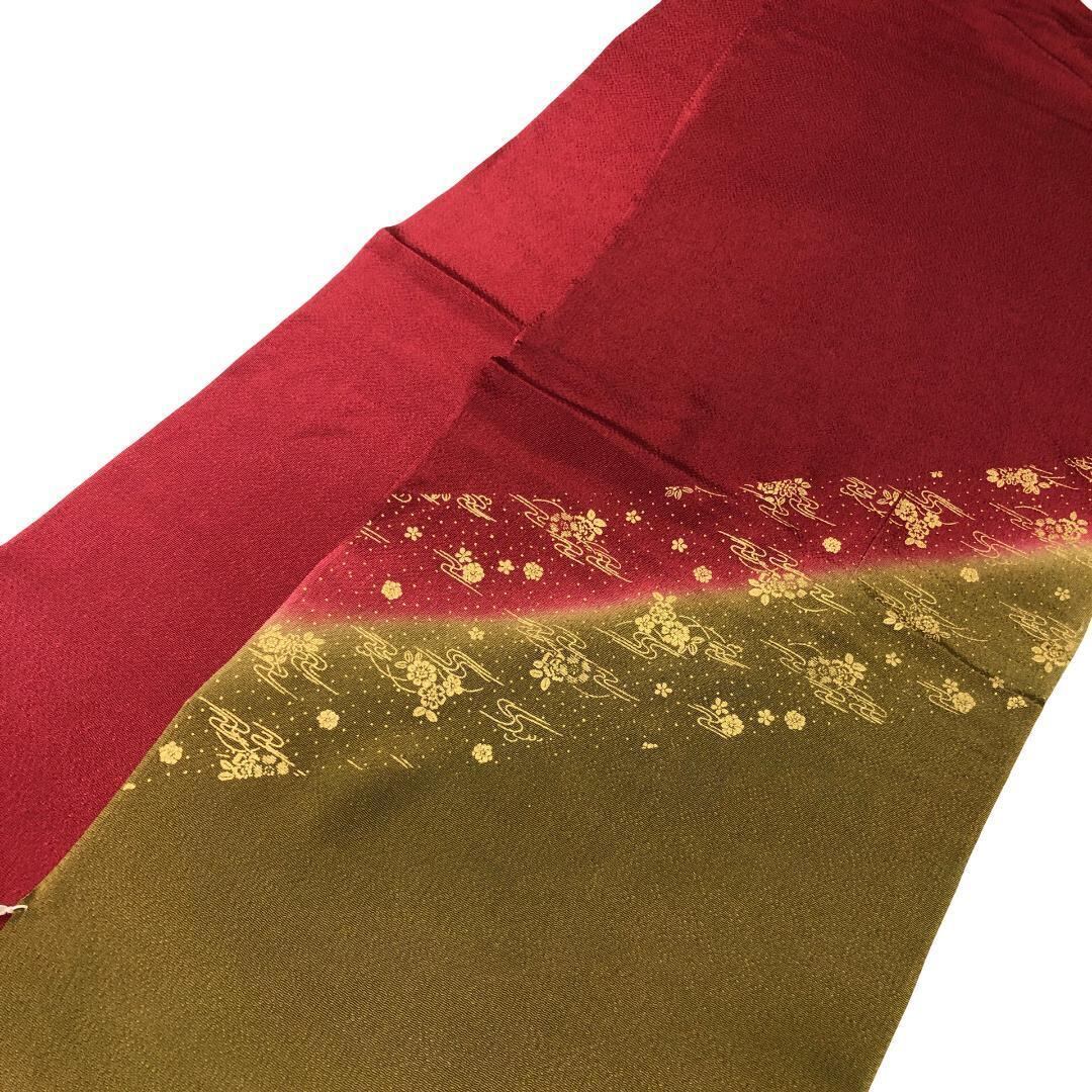 海老色ベースの染分けのお色味に流水に花模様の柄裄がデザインされた素敵なお品でございます。