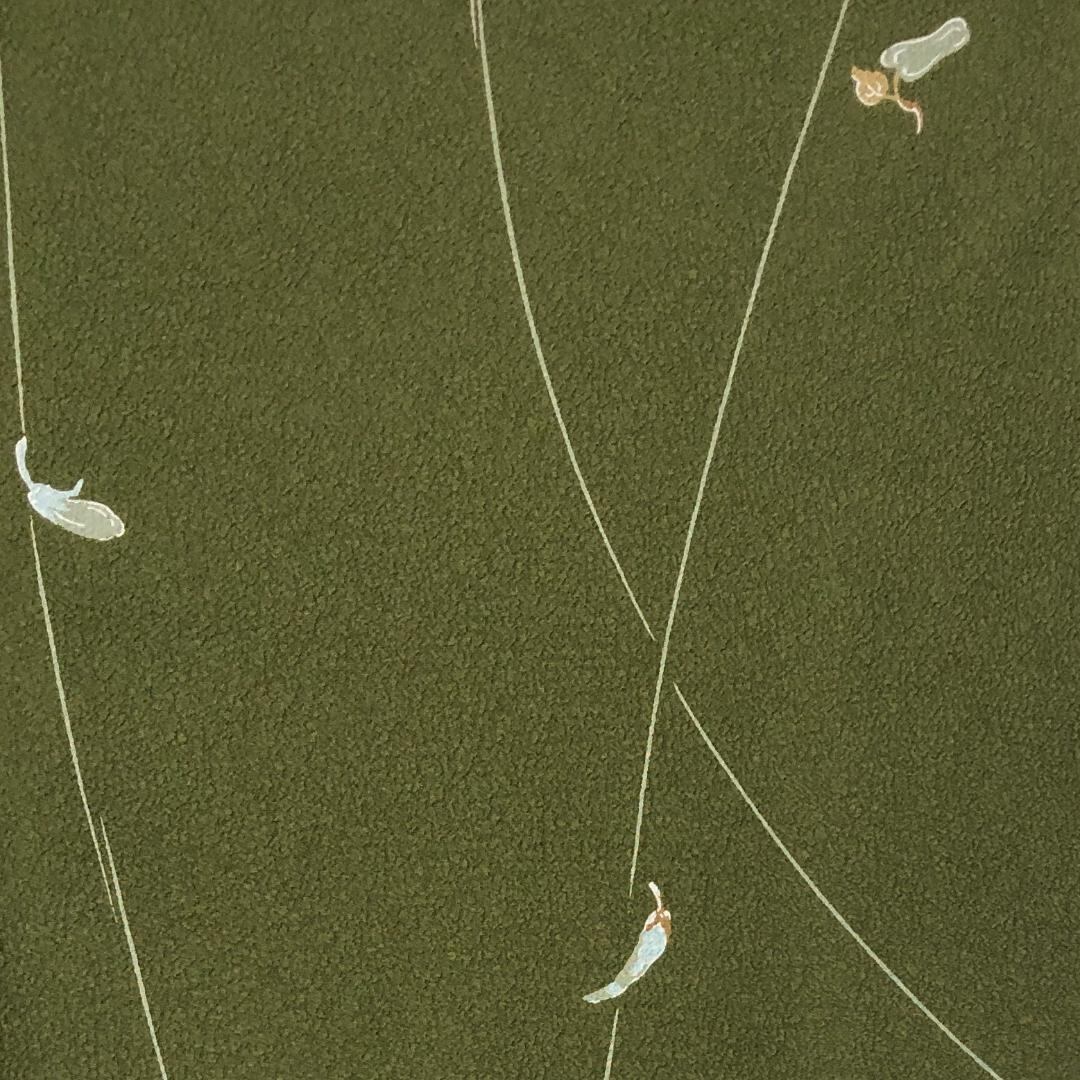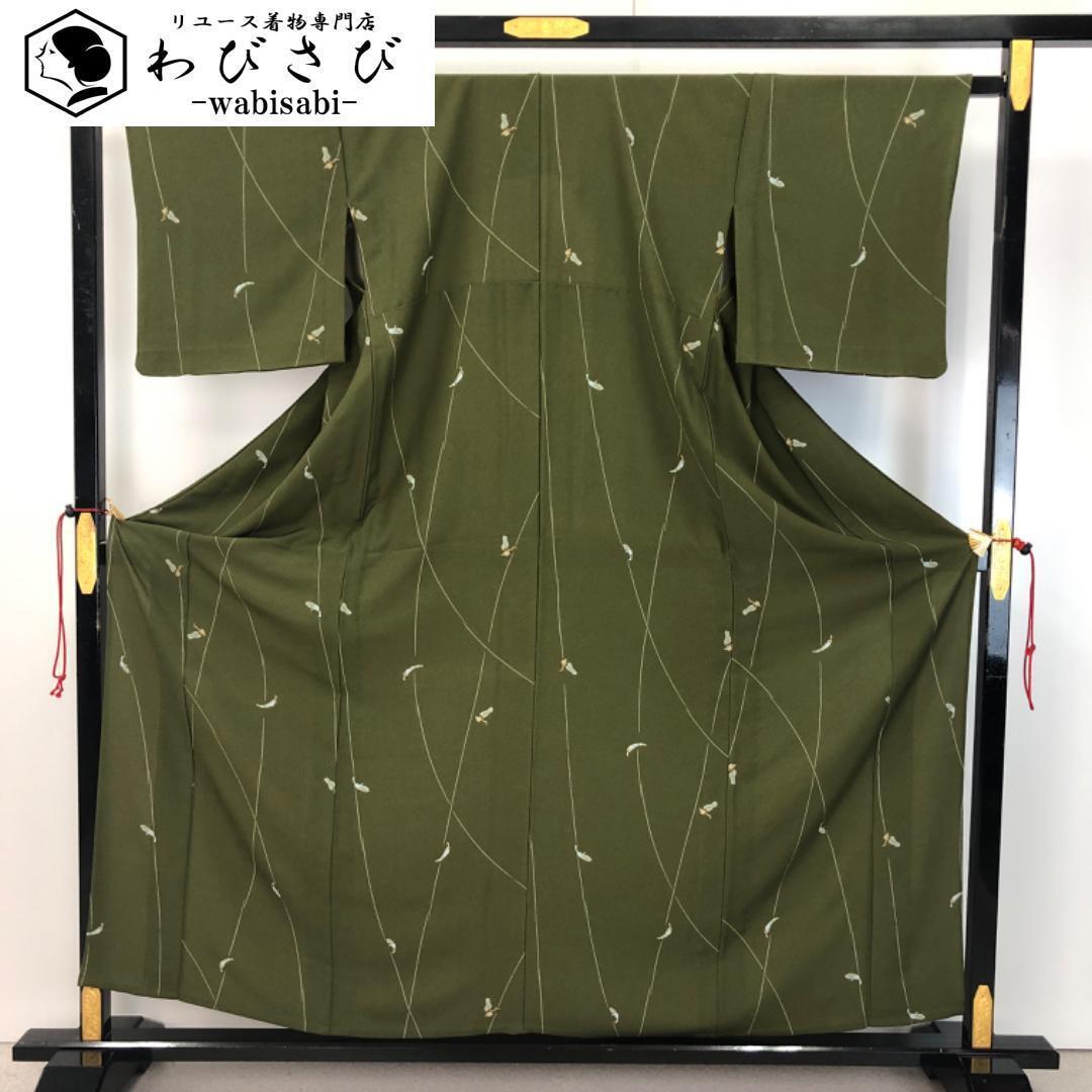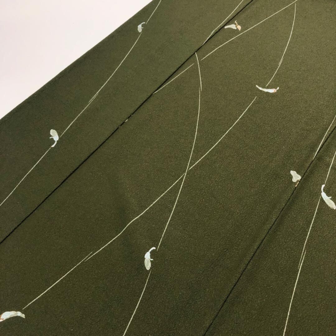 海松色のお色味の縮緬地に飛び柄の夏野菜がデザインされた素敵な柄裄のお品でございます。