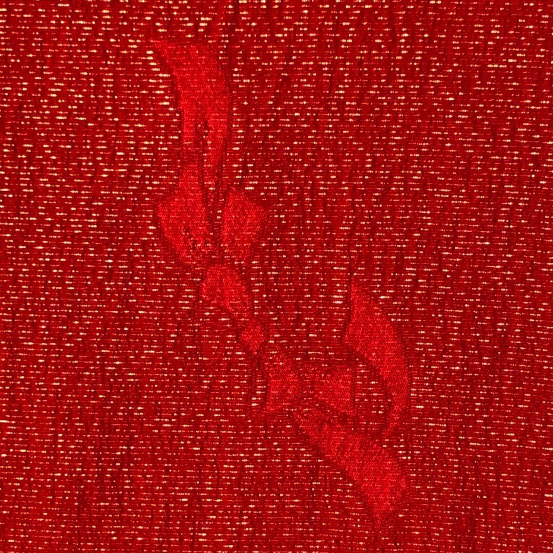 赤色のお色味に抽象模様の柄裄がデザインされた素敵なお品でございます。