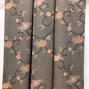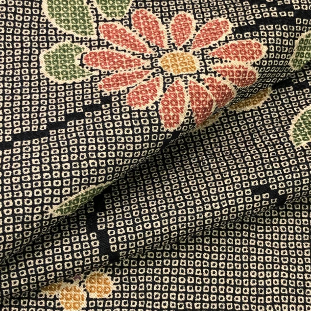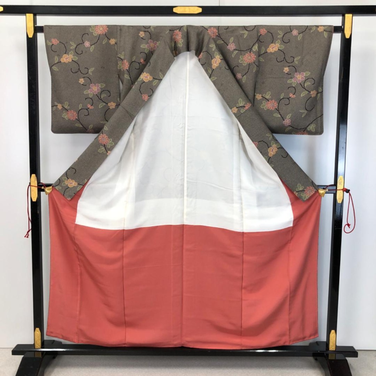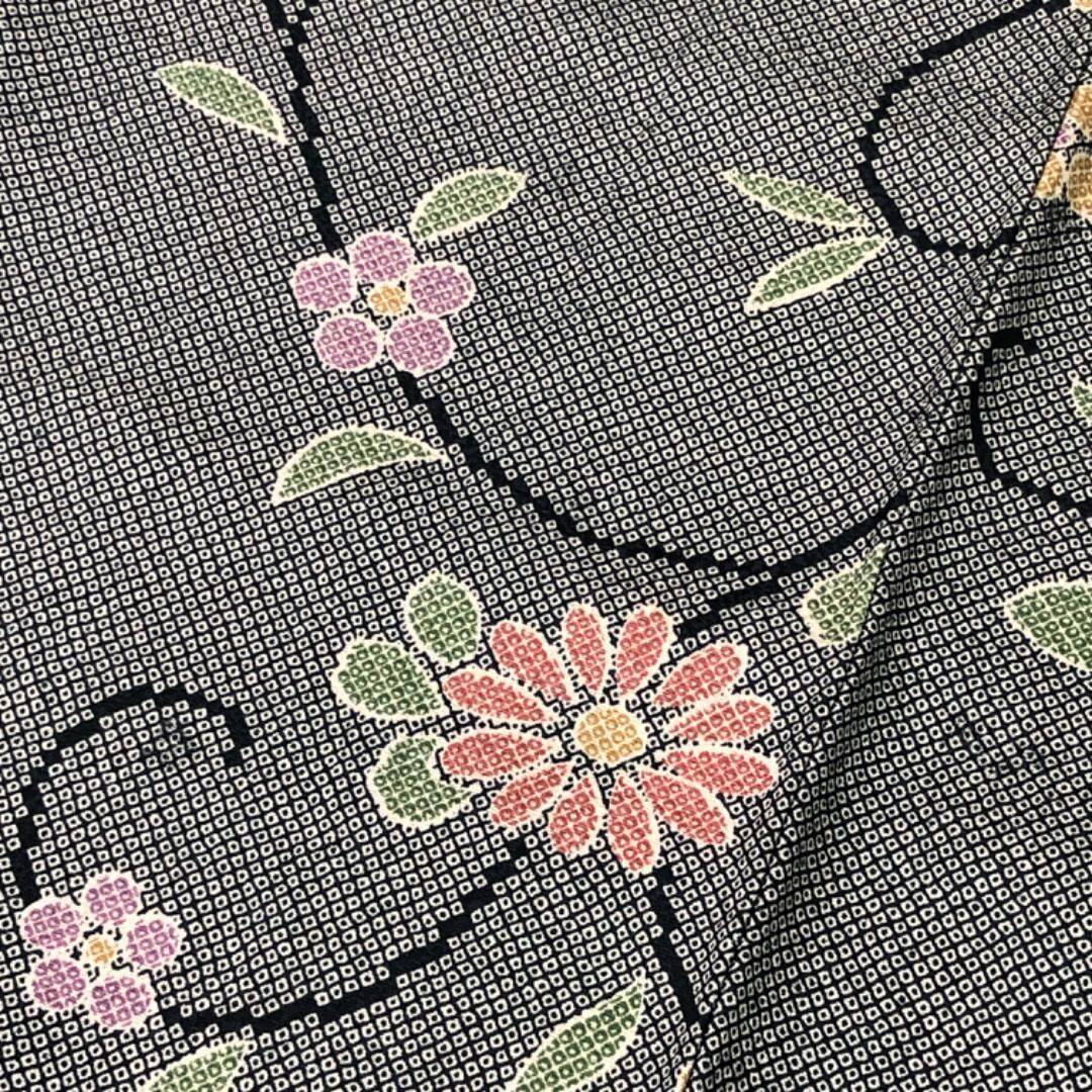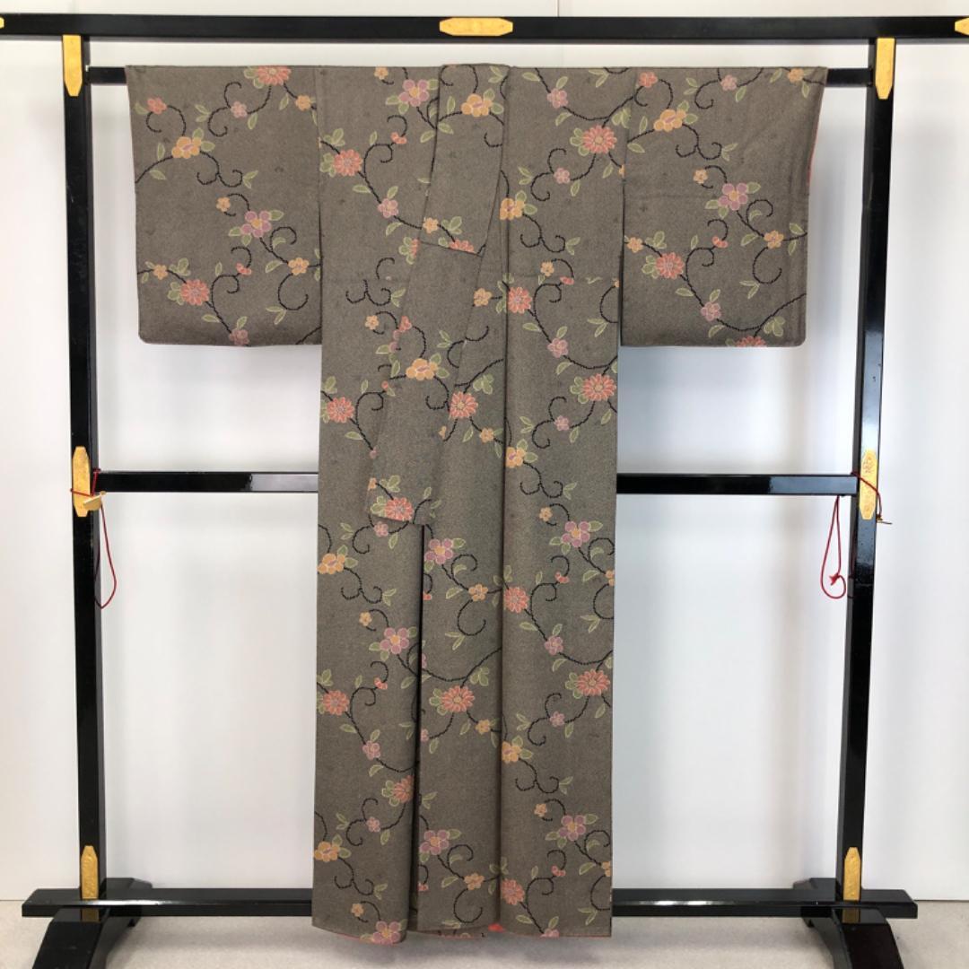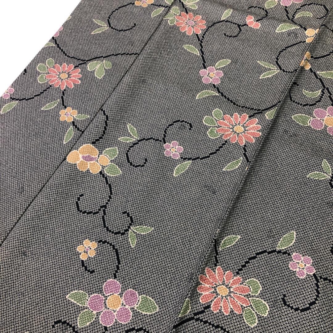 モノトーンベースのお色に鹿子模様、花唐草模様の柄裄がデザインされた素敵なお品でございます。