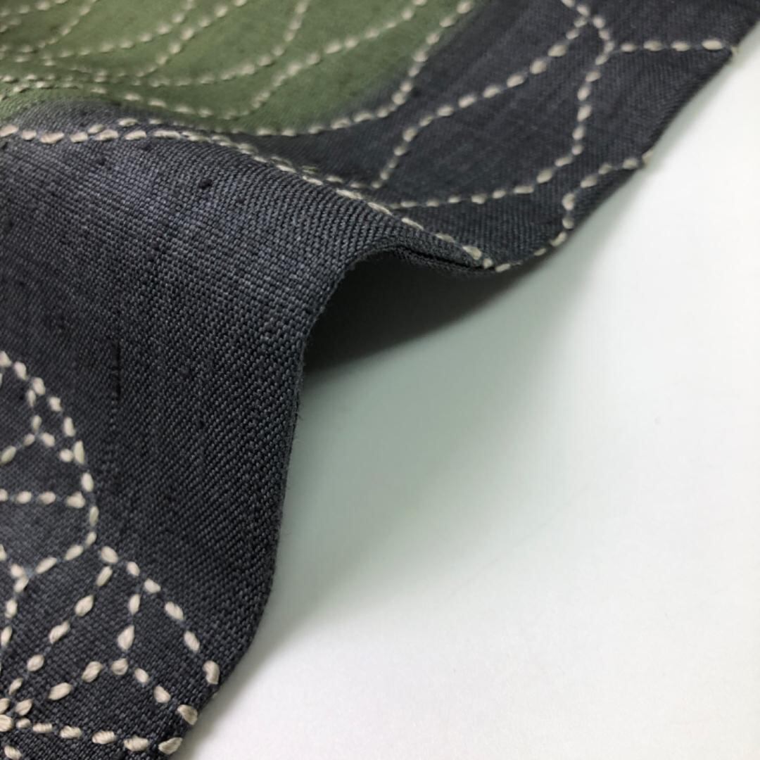 勝軍色ベースの染分けの落ち着いた色彩の紬地に刺し子の七宝、立涌などがデザインされた雰囲気の良い素敵なお品でございます。