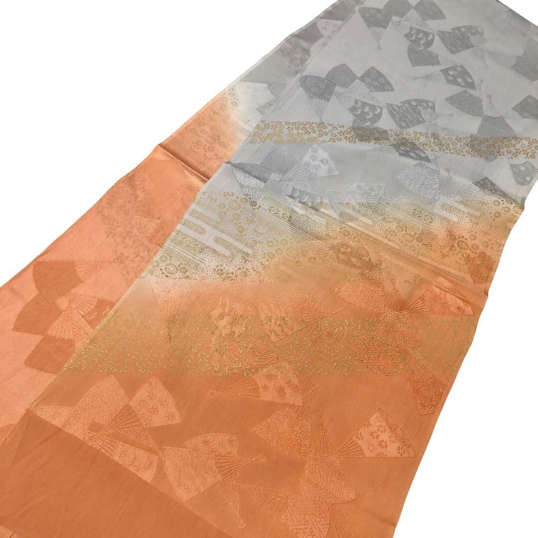 緋褪色ベースのお色味に扇子にエ霞、花模様の柄裄がデザインされた素敵なお品でございます。