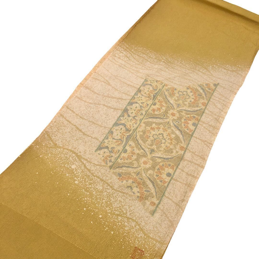 黄土色のお色味に抽象華模様の柄裄がデザインされた素敵なお品でございます。