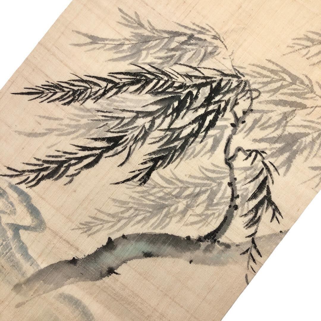 夏帯 名古屋帯 麻 墨描き 柳模様 鳥の子色 O-5157 着物 きもの kimono 和服 和装 中古 リサイクル着物 【送料無料】