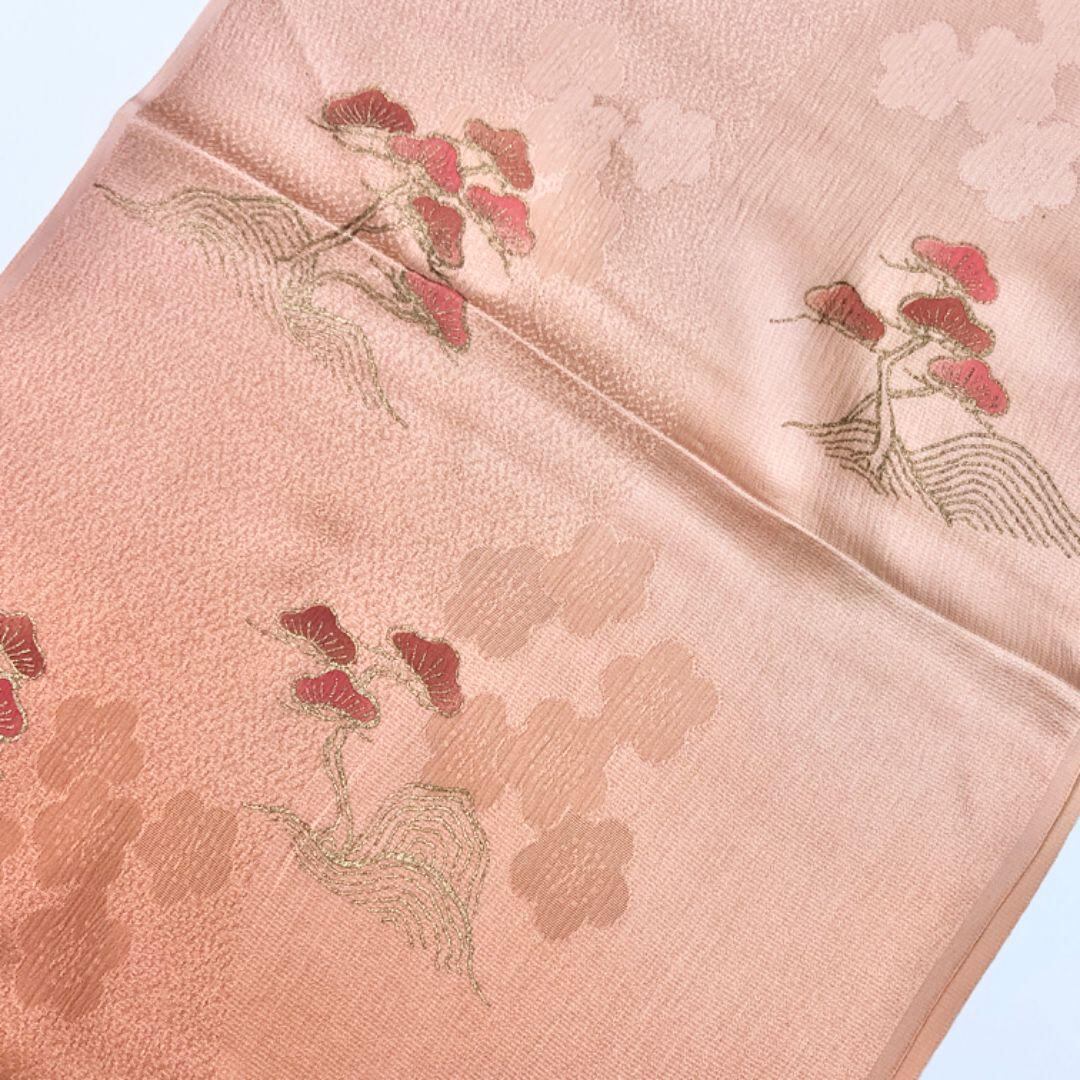 淡紅赤色ベースのグラデーションのお色味に松、梅の柄裄がデザインされた素敵なお品でございます。