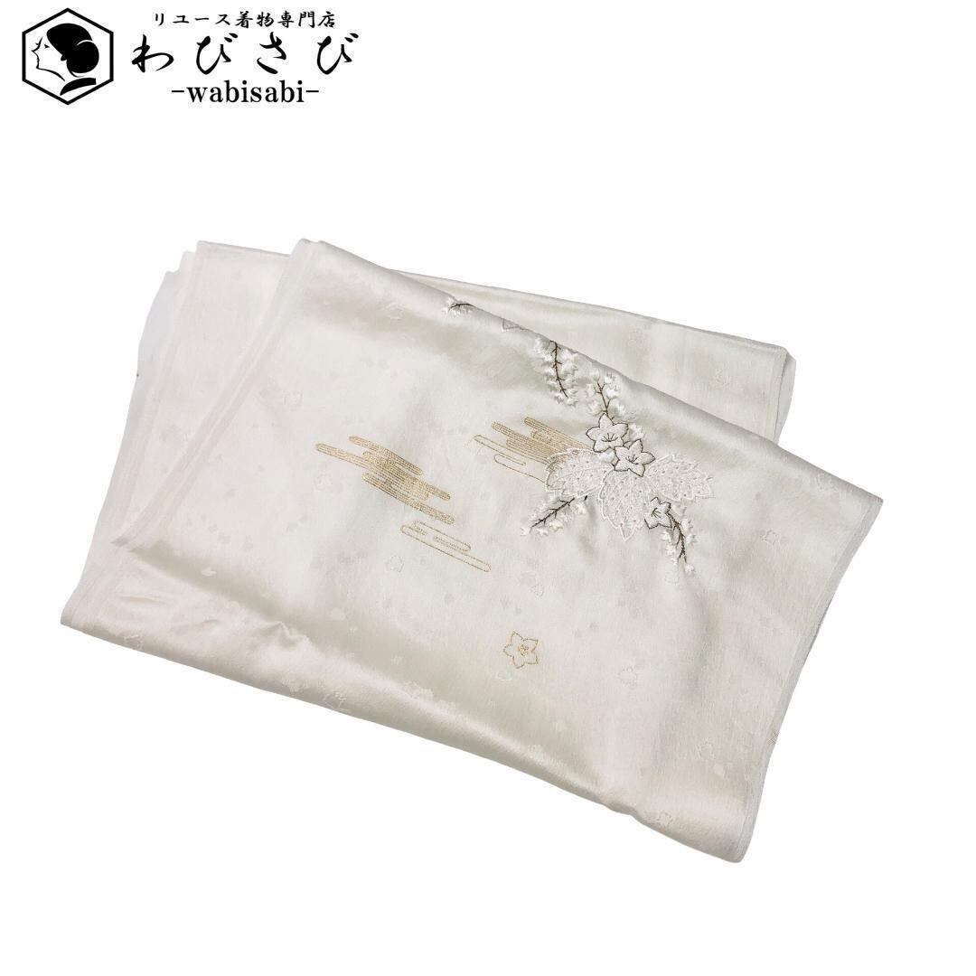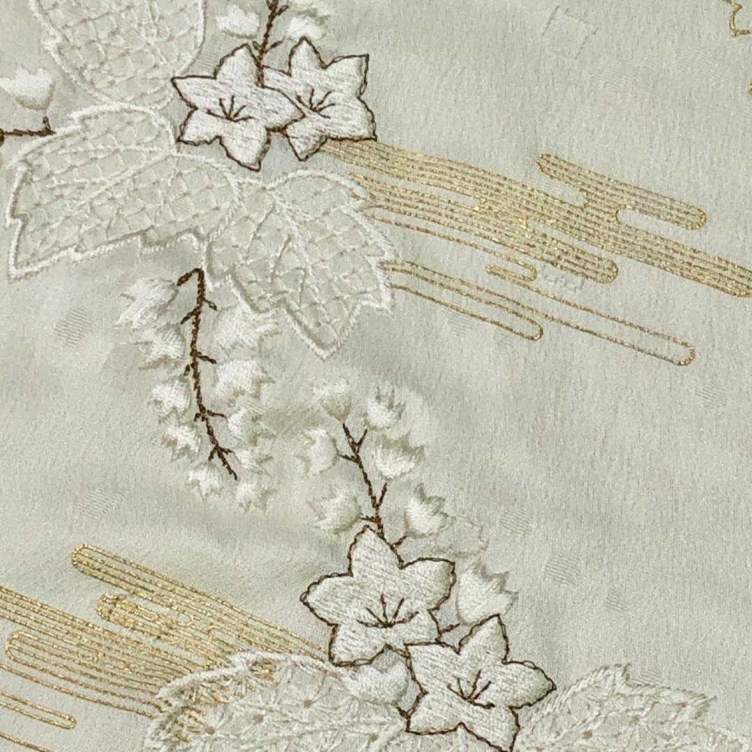 乳白色のお色味に刺繍で花模様にエ霞の柄裄がデザインされた素敵なお品でございます。