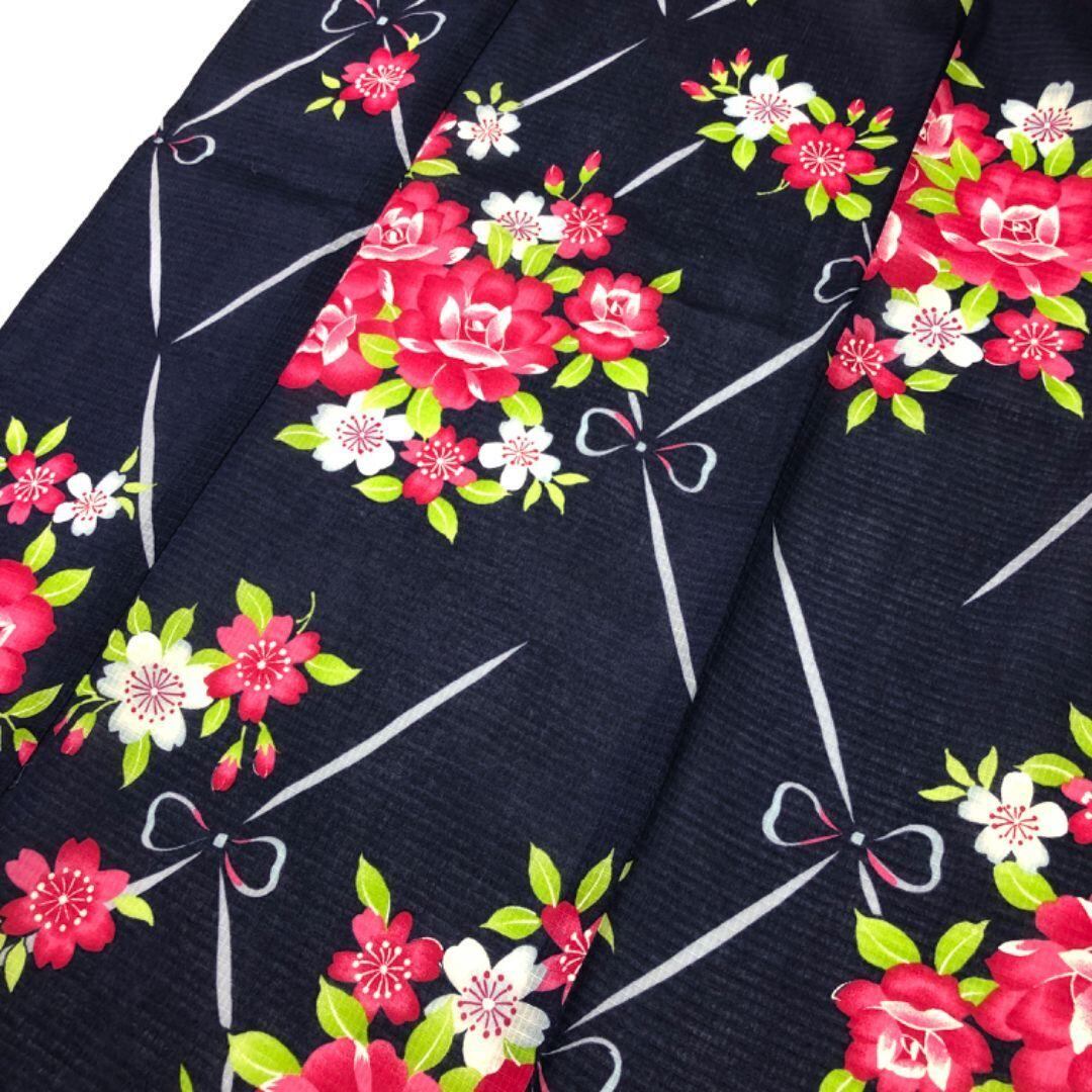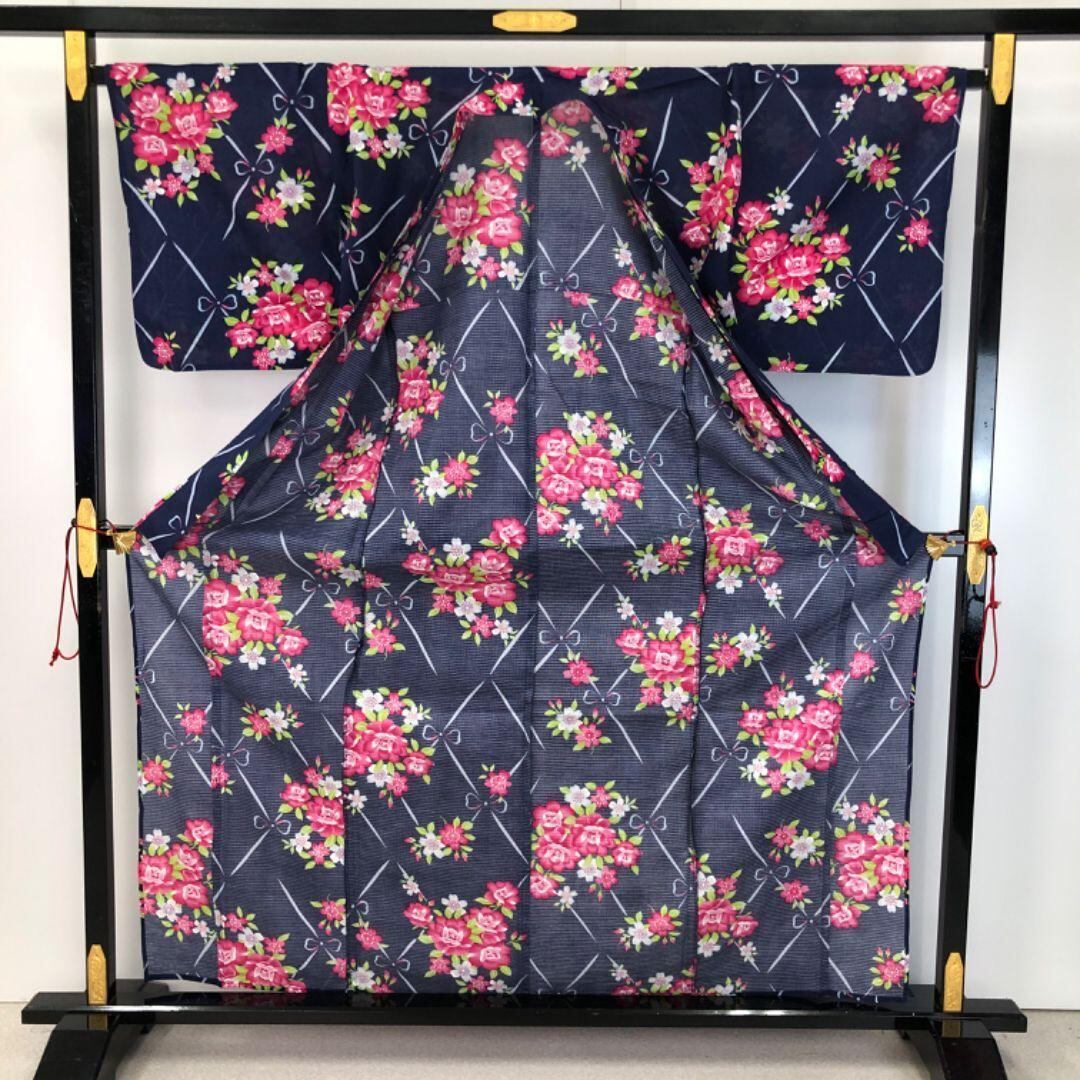 夏着物 浴衣 綿紅梅 花模様 紺色 K-5138 着物 きもの kimono 和服 和装 中古 リサイクル着物 【送料無料】