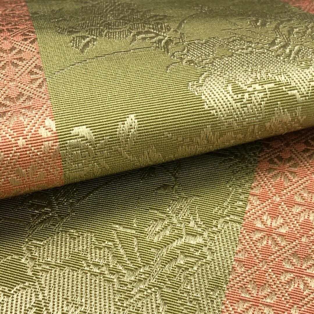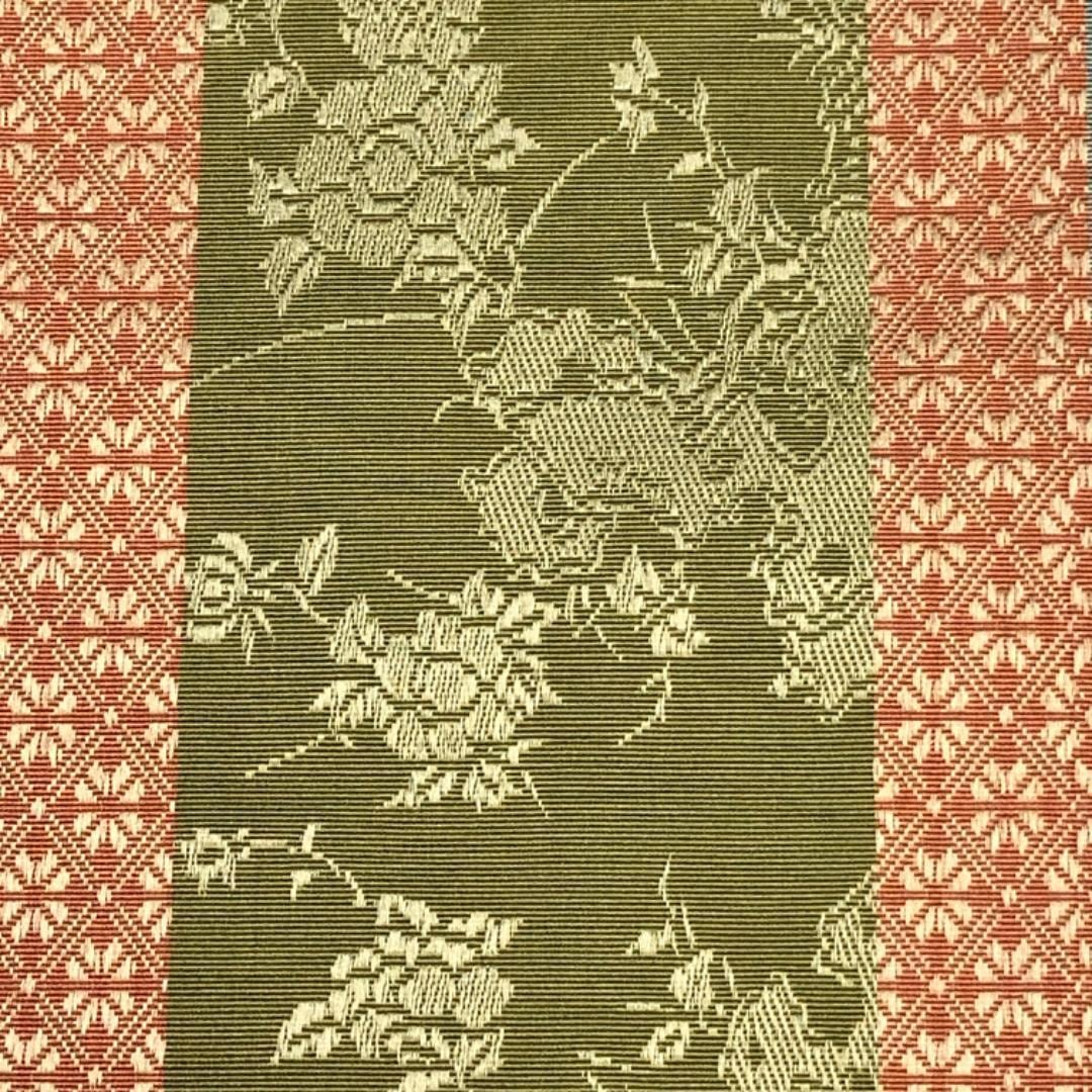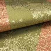 鶸茶色のお色味に花菱、花柄模様がデザインされた素敵な柄裄のお品でございます。