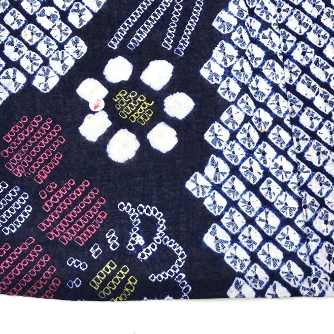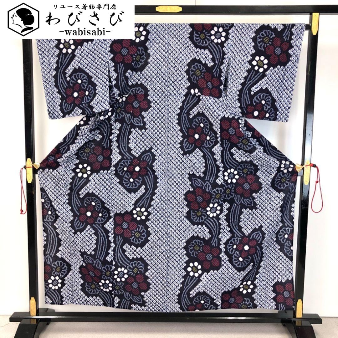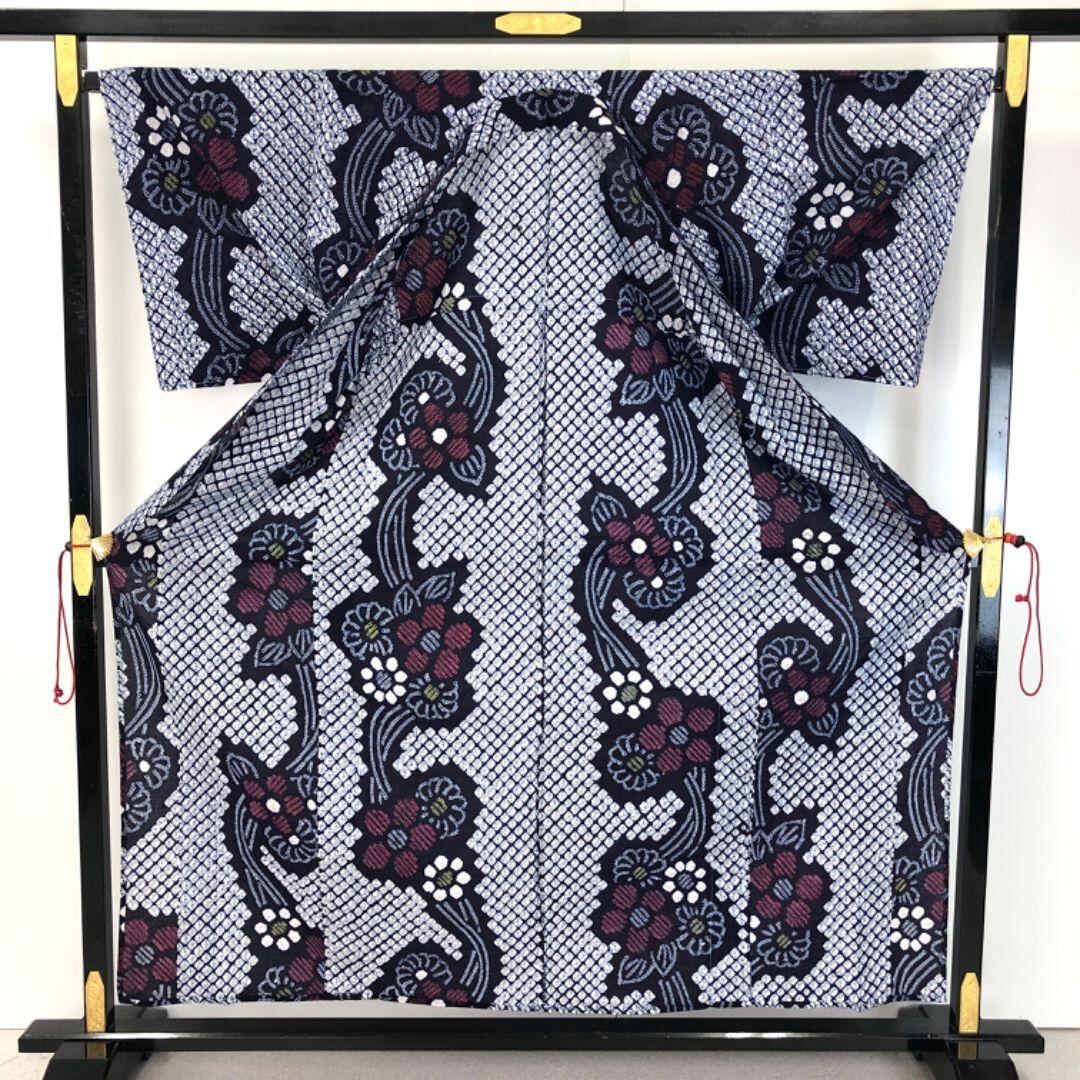 夏着物 浴衣 有松鳴海本絞り 縦縞花柄模様 紺鉄色 K-5141 着物 きもの kimono 和服 和装 中古 リサイクル着物 【送料無料】