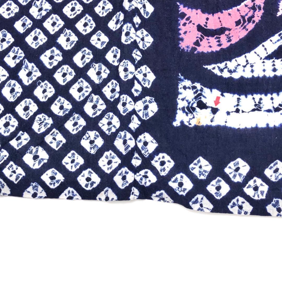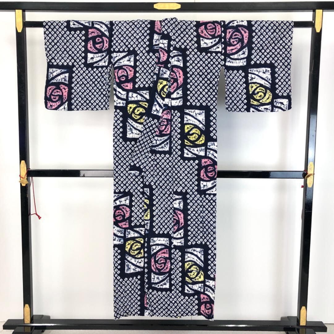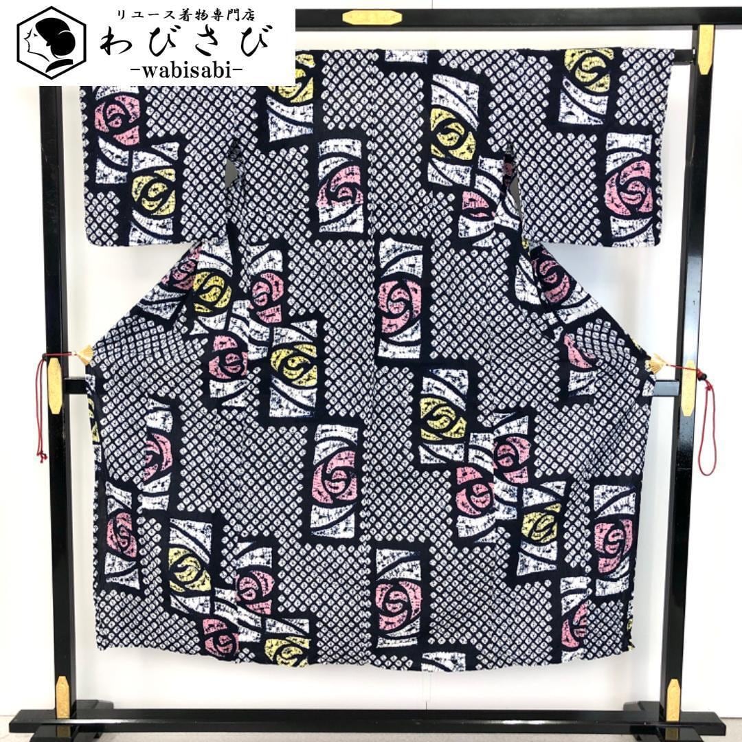 紺鉄色のお色味に長方形に抽象花模様がデザインされた素敵な柄裄のお品でございます。