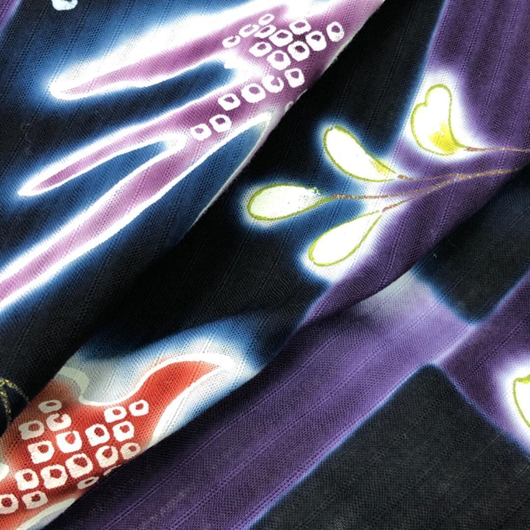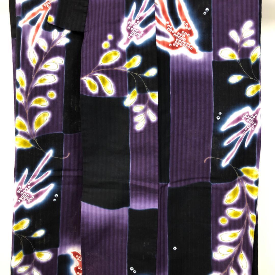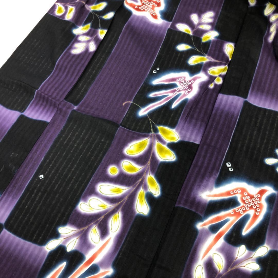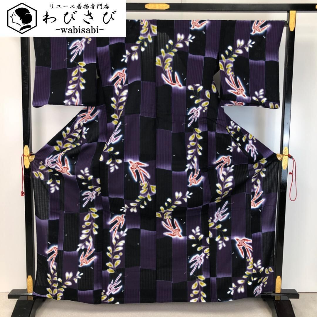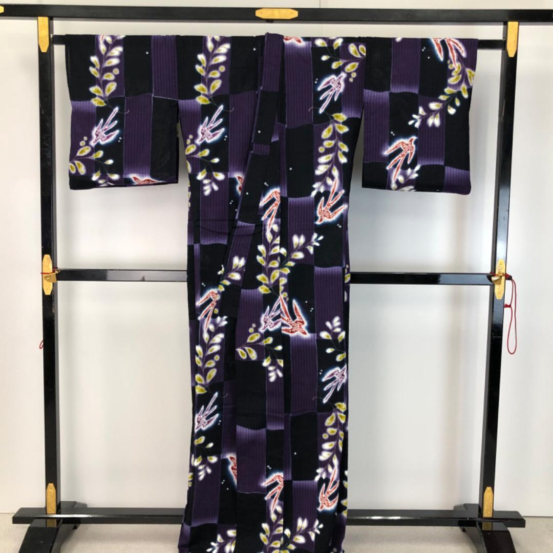 紫紺色ベースのお色味に燕の柄裄がデザインされた素敵なお品でございます。