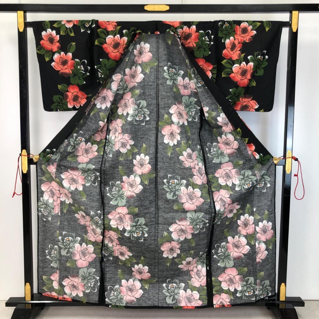 黒色のお色味に花模様の柄裄がデザインされた素敵なお品でございます。