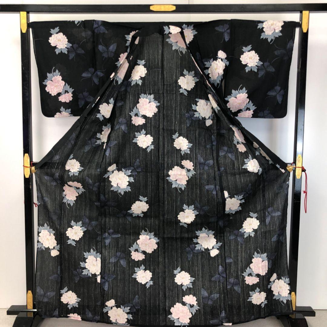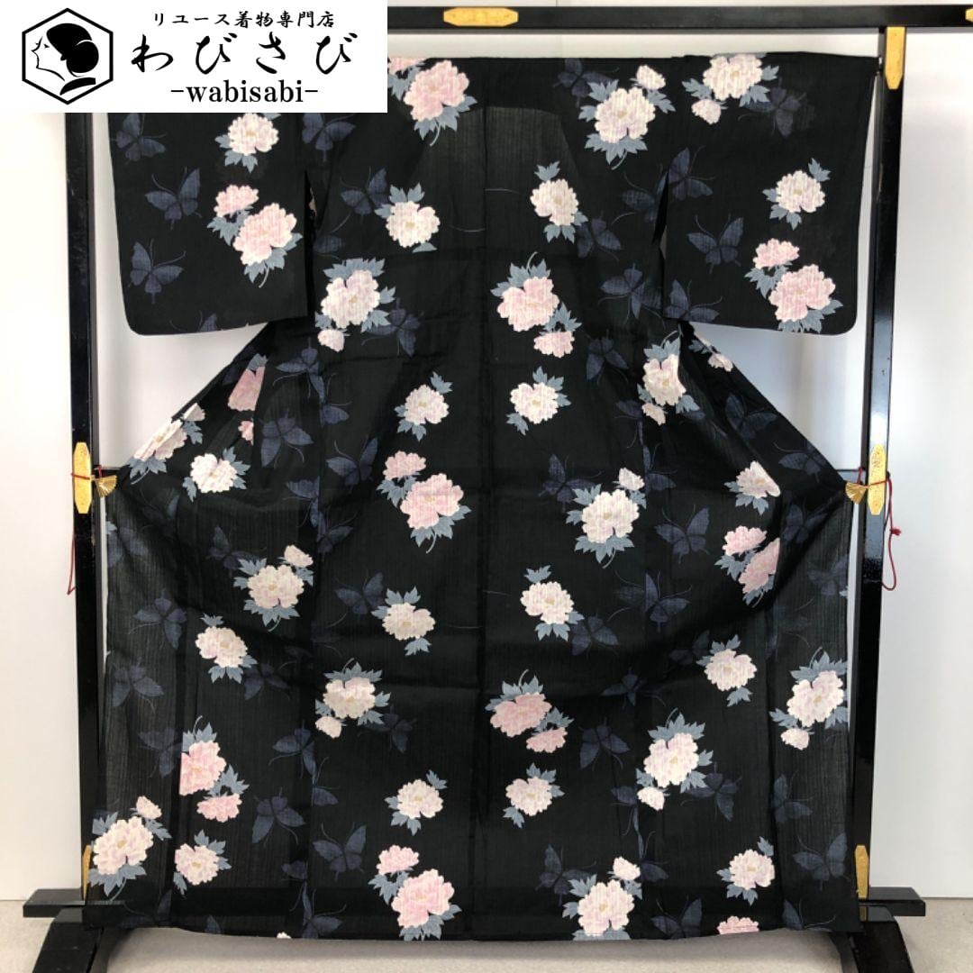 夏着物 浴衣 牡丹の花模様 蝶々 黒色 K-5134 着物 きもの kimono 和服 和装 中古 リサイクル着物 【送料無料】