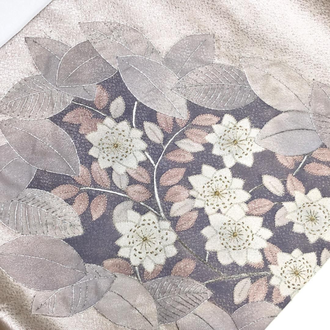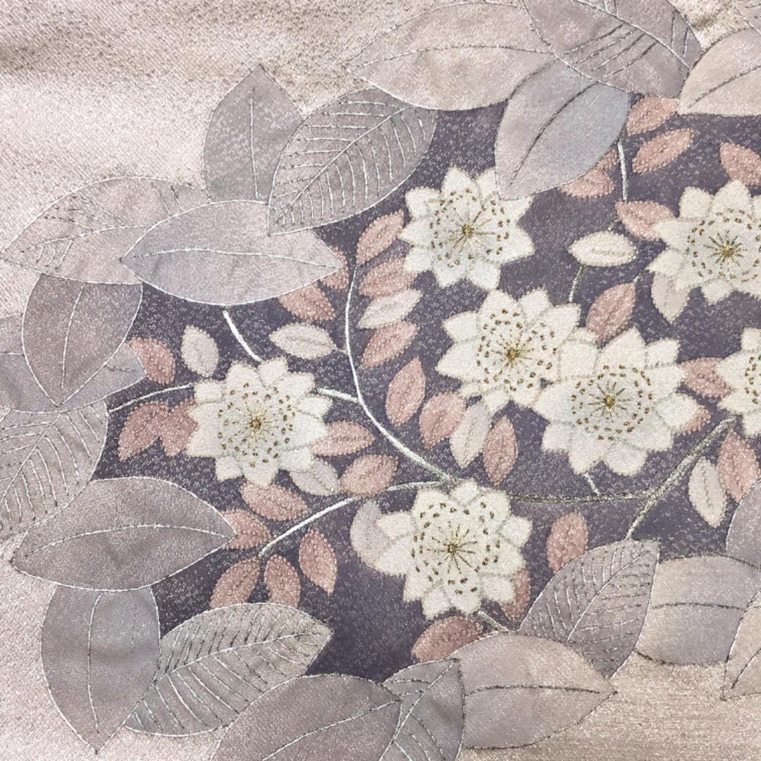 名古屋帯 花模様 相良刺繍 金銀糸 灰桜色 O-5253 着物 きもの kimono 和服 和装 中古 リサイクル着物 【送料無料】