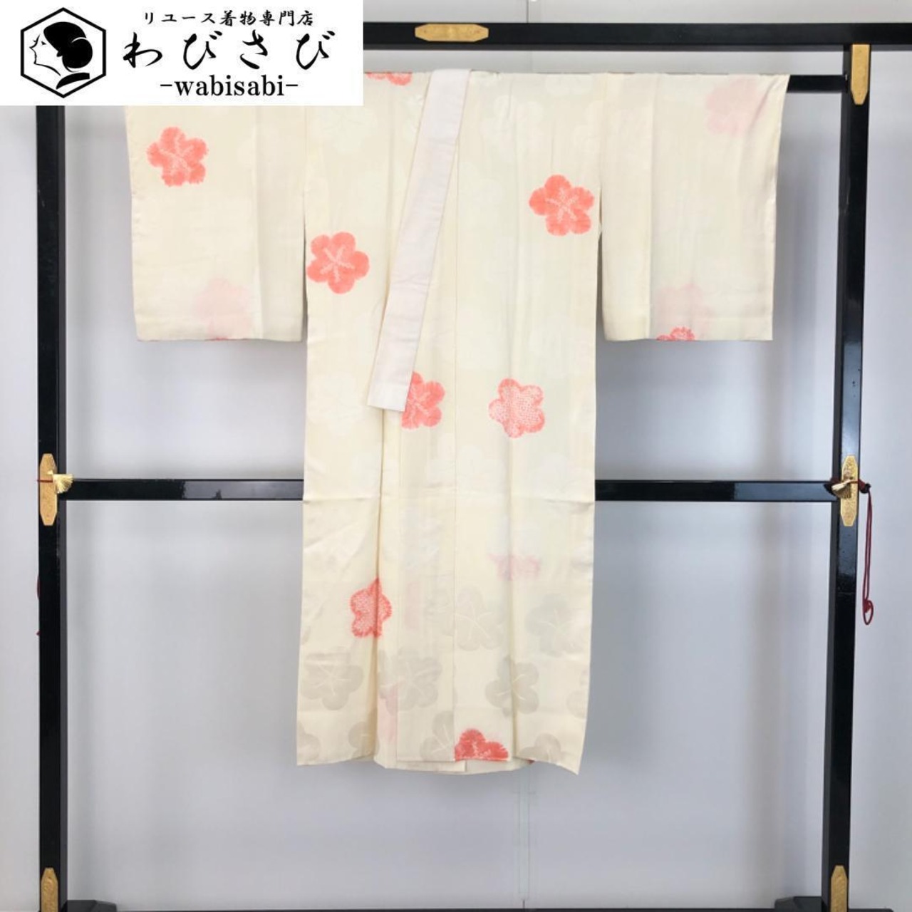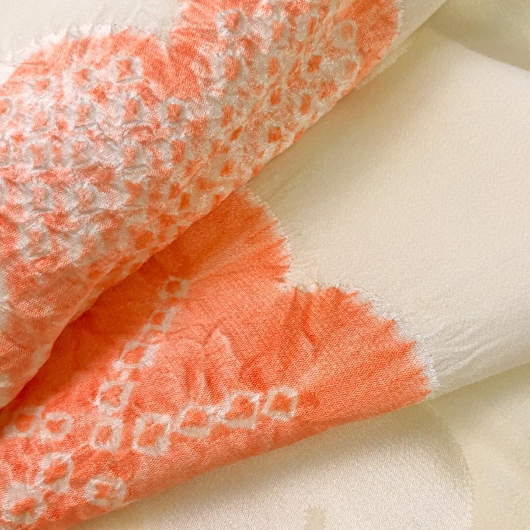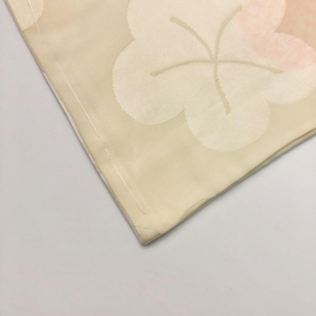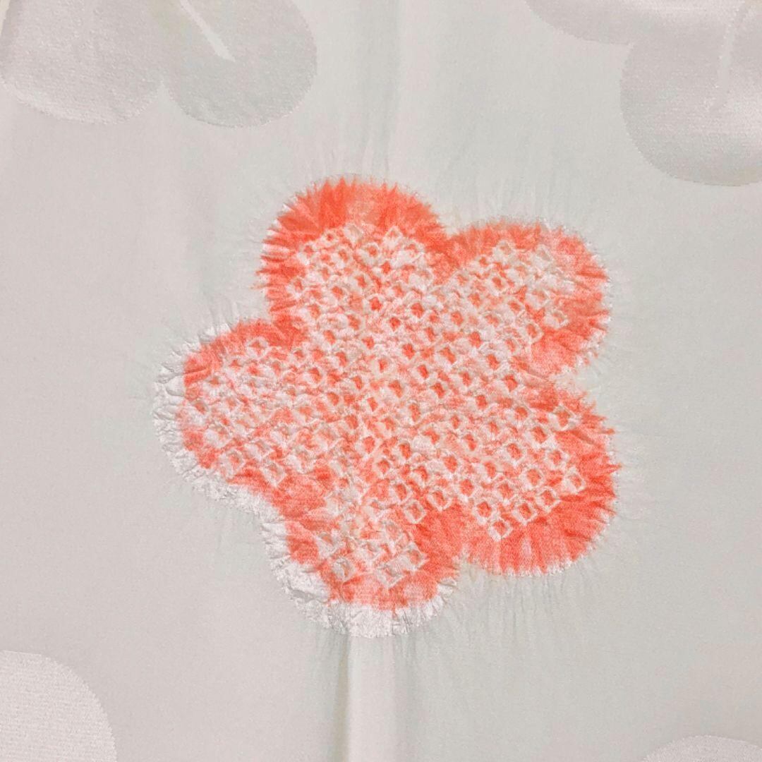 薄淡黄色のお色味に絞りの花模様の柄裄がデザインされた素敵なお品でございます。