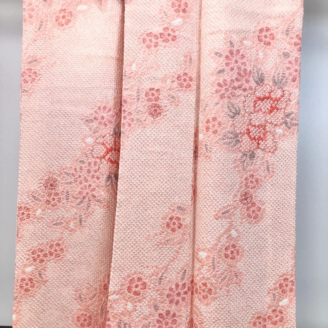 薄紅梅色ベースのお色味の総絞り、色彩の美しい花模様の柄裄がデザインされた素敵なお品でございます。
