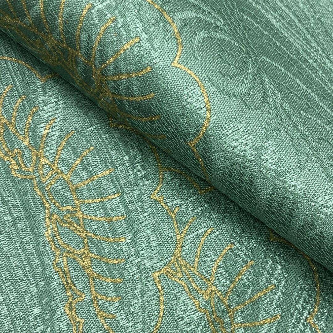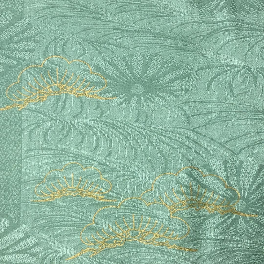 緑色ベースのお色味に菊、松模様がデザインされた帯揚げ、高麗組の素敵なお品でございます。
