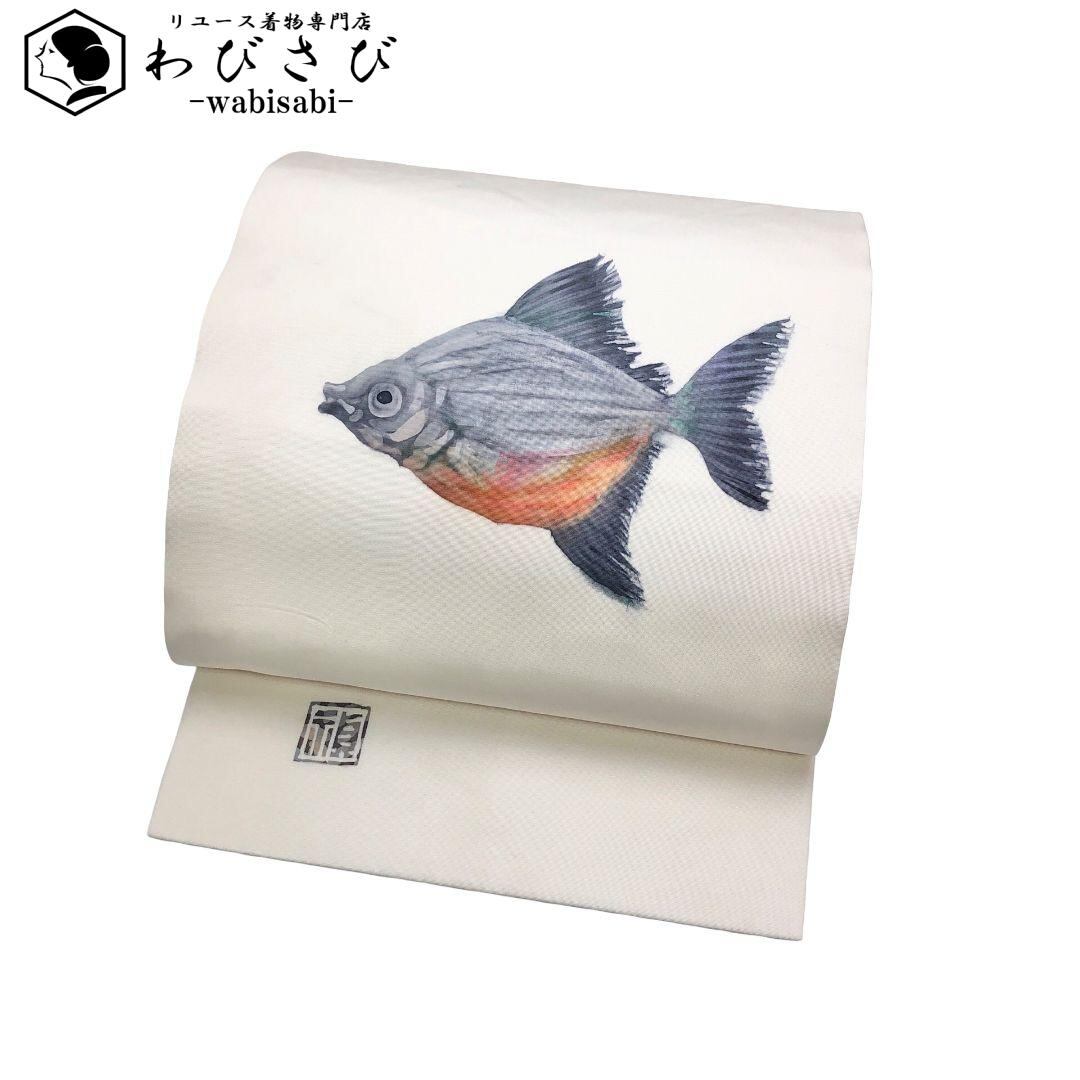 名古屋帯 塩瀬 作家物 手描き 魚柄 乳白色 O-5289 着物 きもの kimono 和服 和装 中古 リサイクル着物 【送料無料】