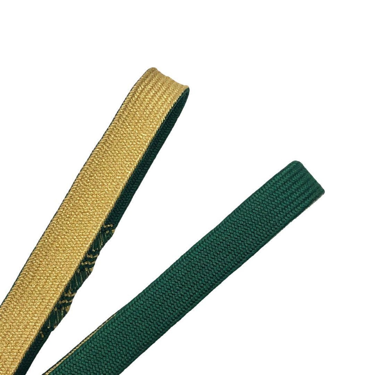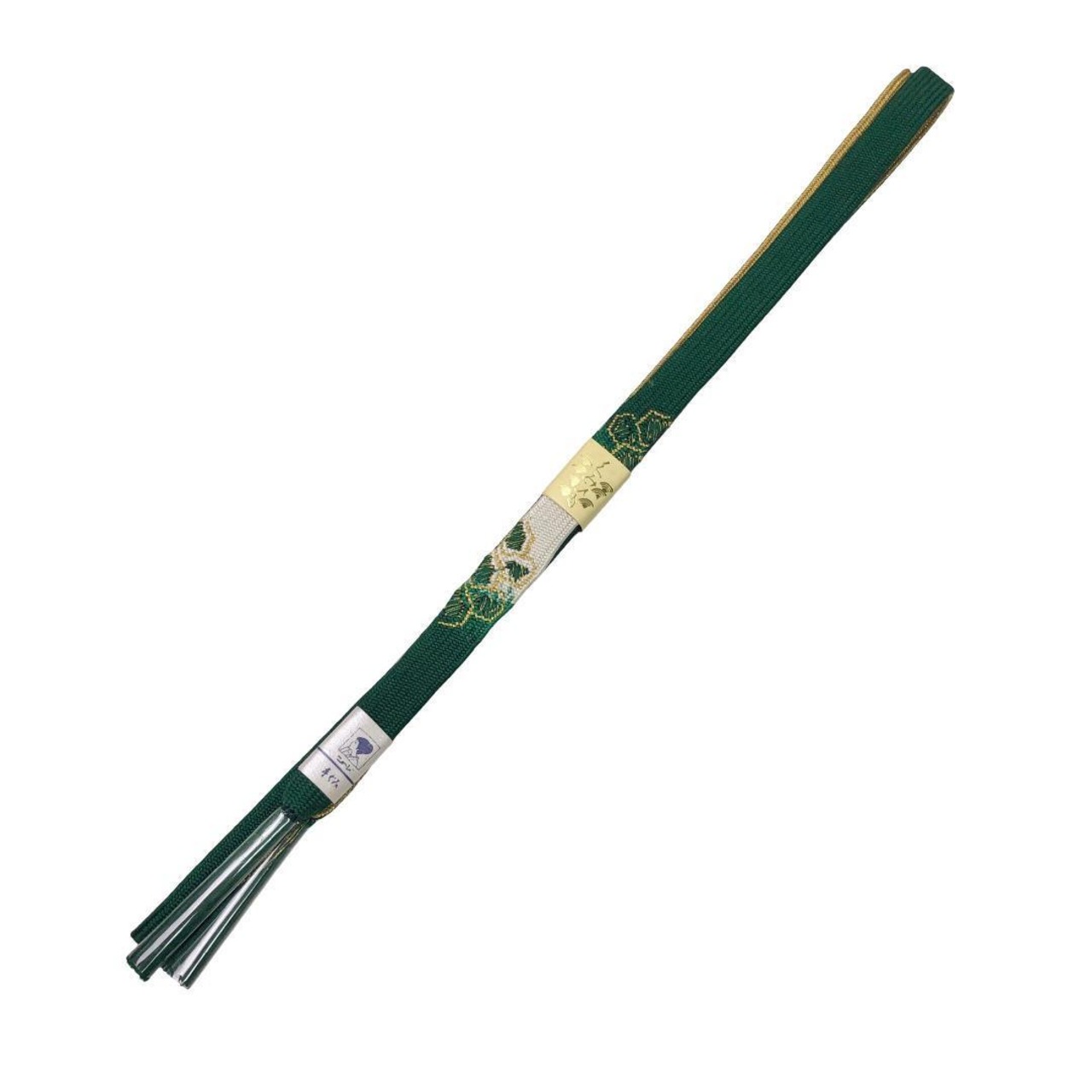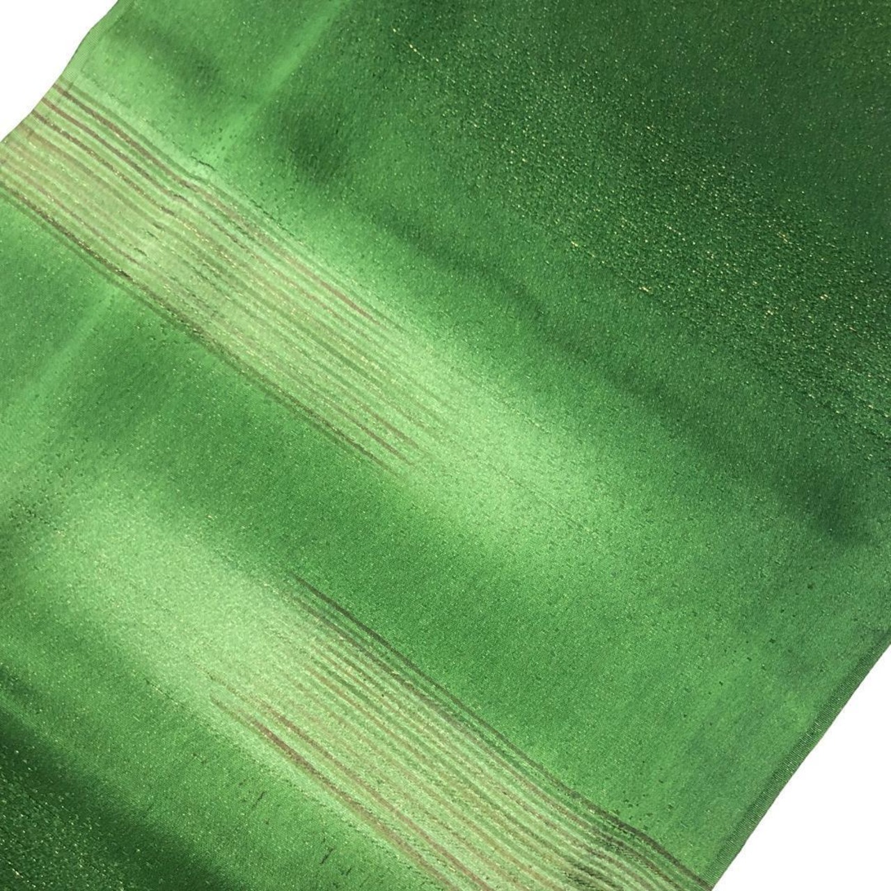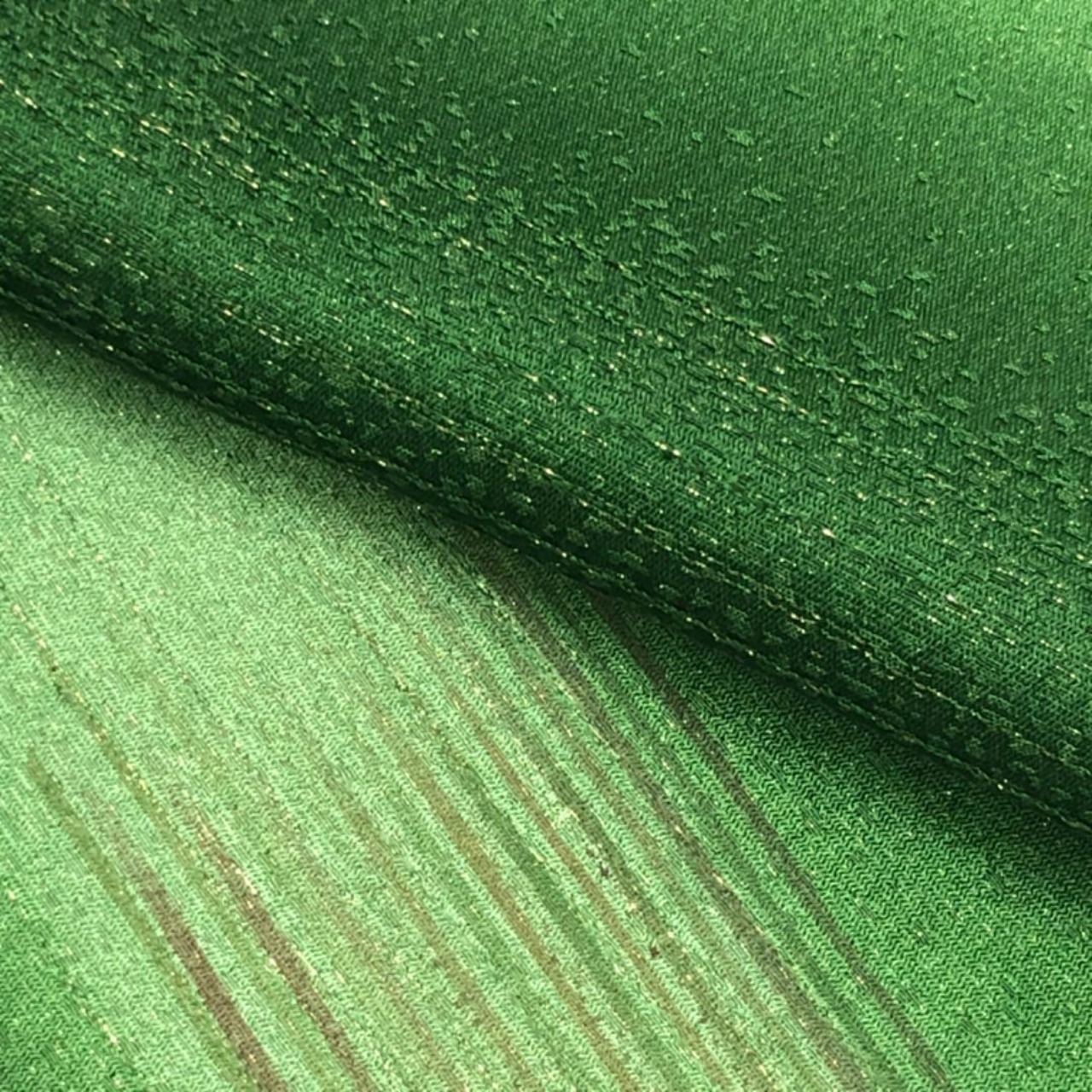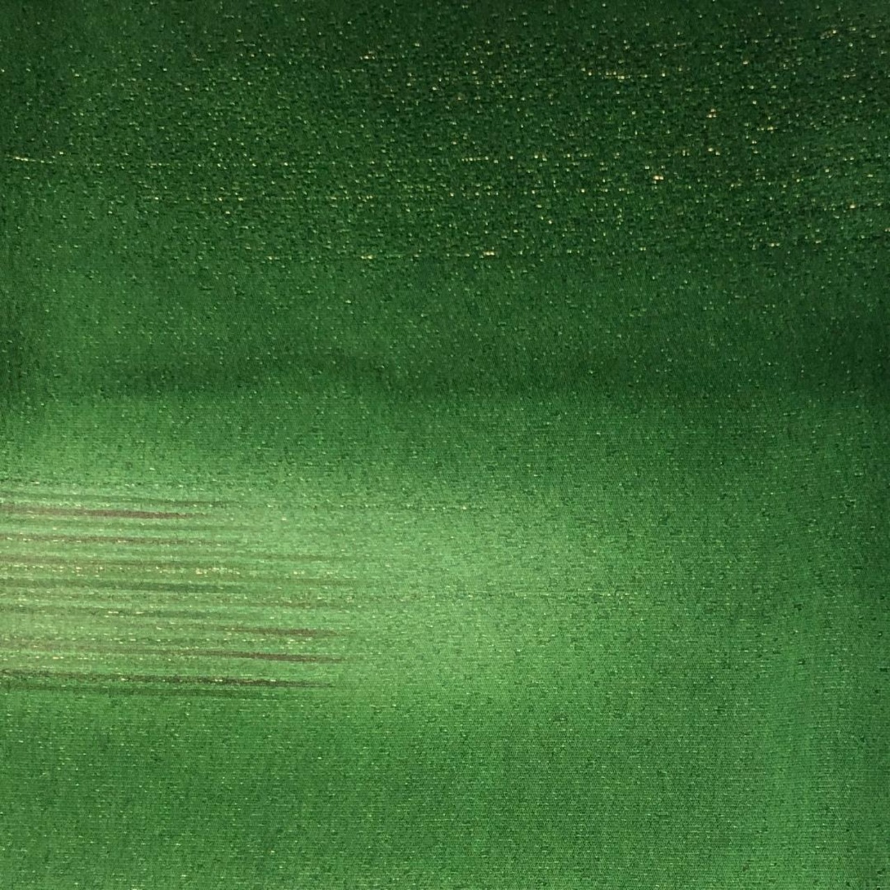 緑色ベースのお色味に横縞抽象模様がデザインされた帯揚げ、高麗組の素敵なお品でございます。