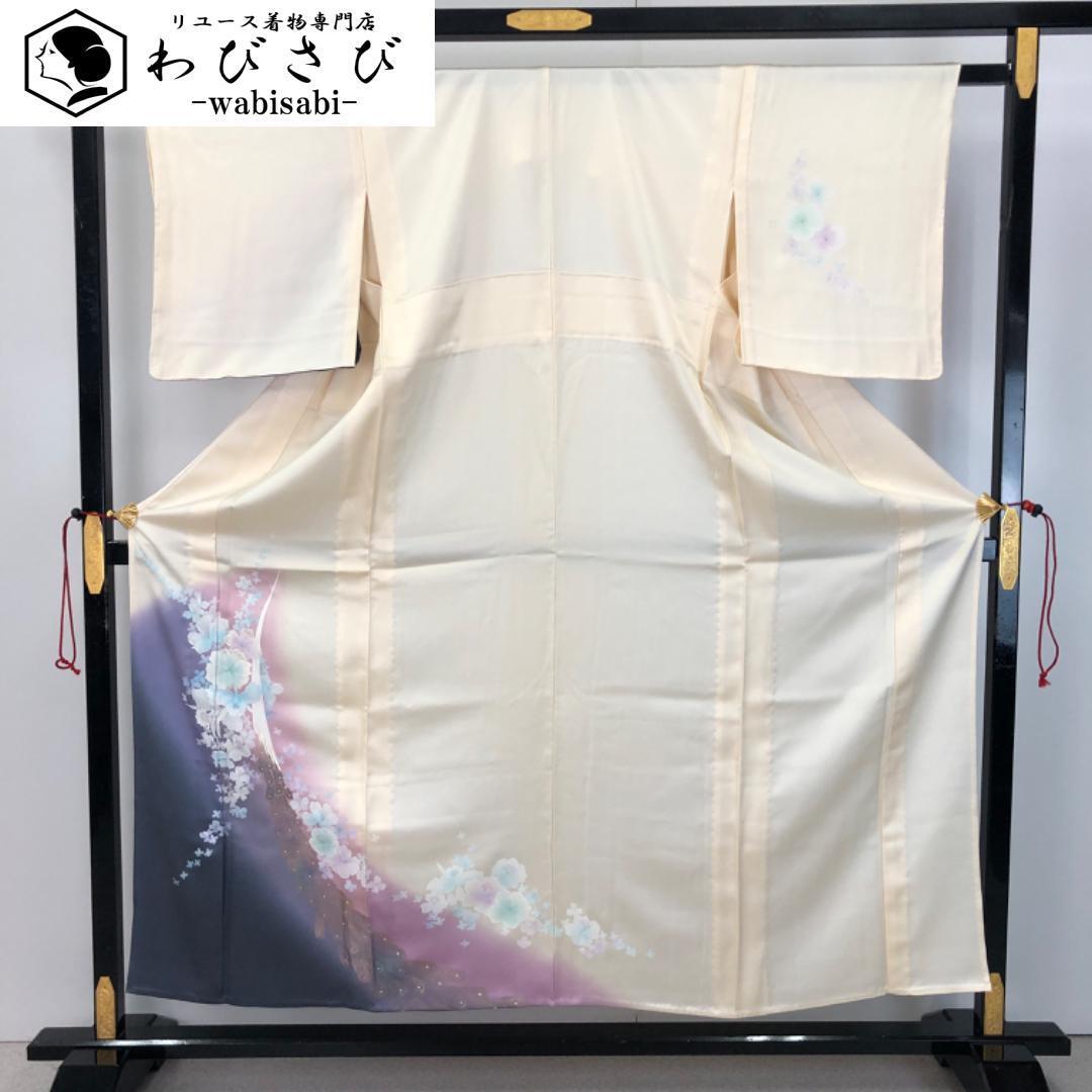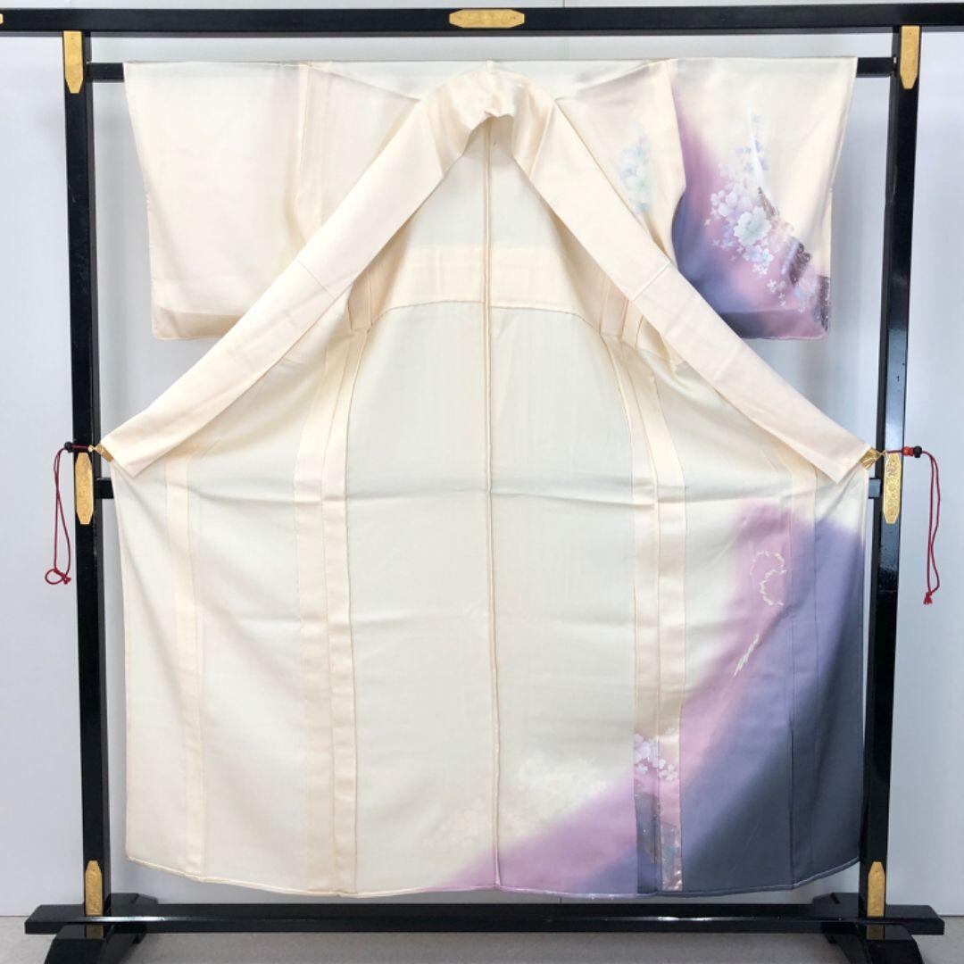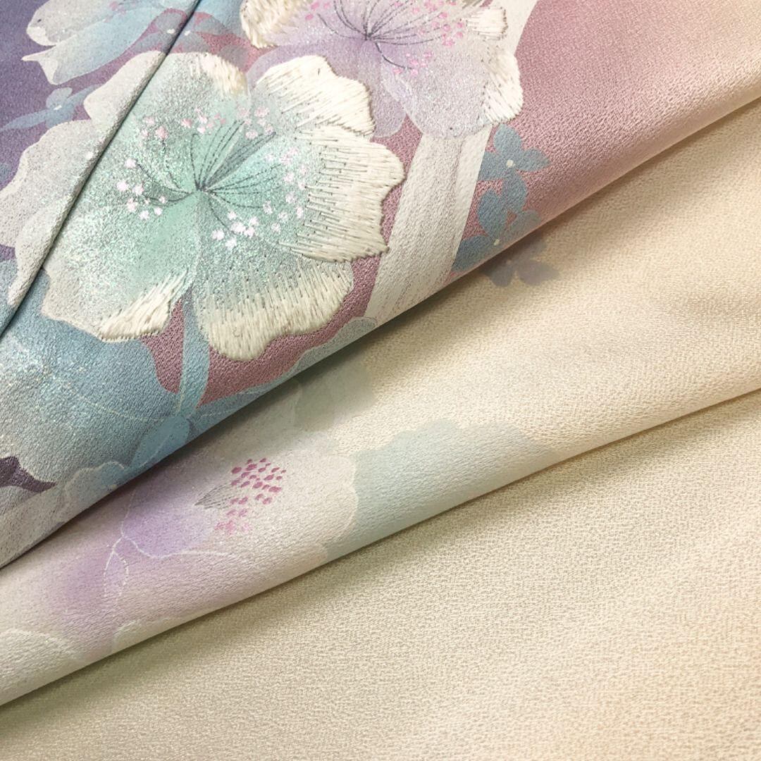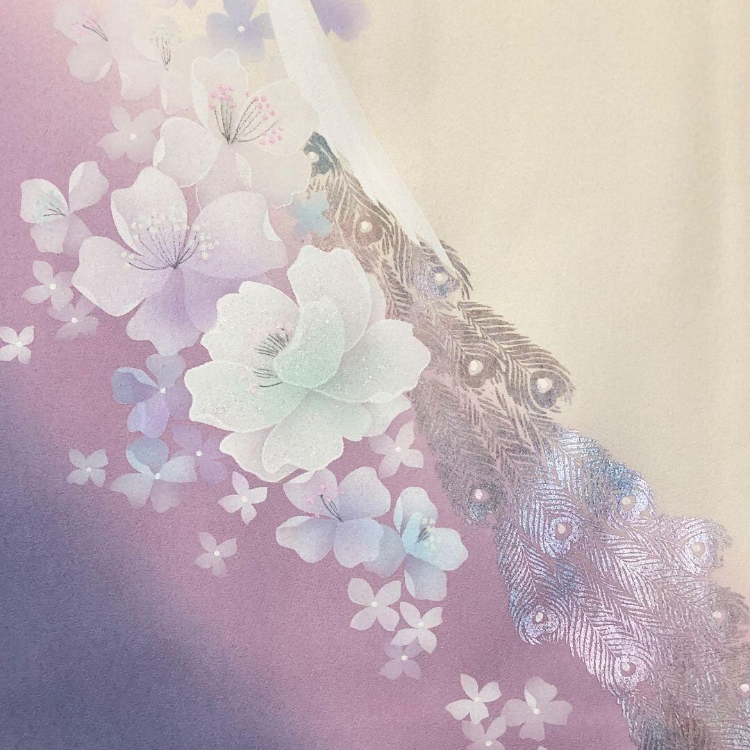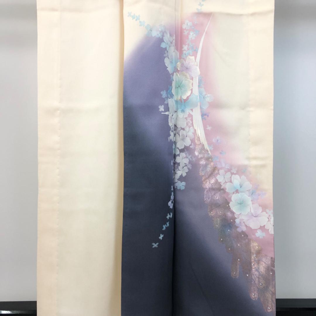 乳白色の上品なお色味のグラデーション、一部刺繍の孔雀の羽に花模様がデザインされた素敵な柄裄のお品でございます。