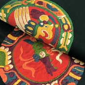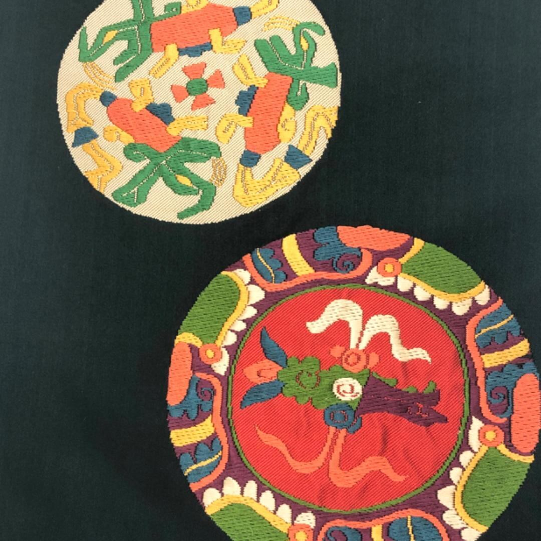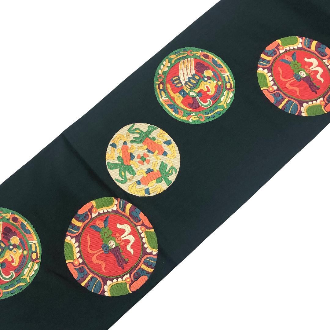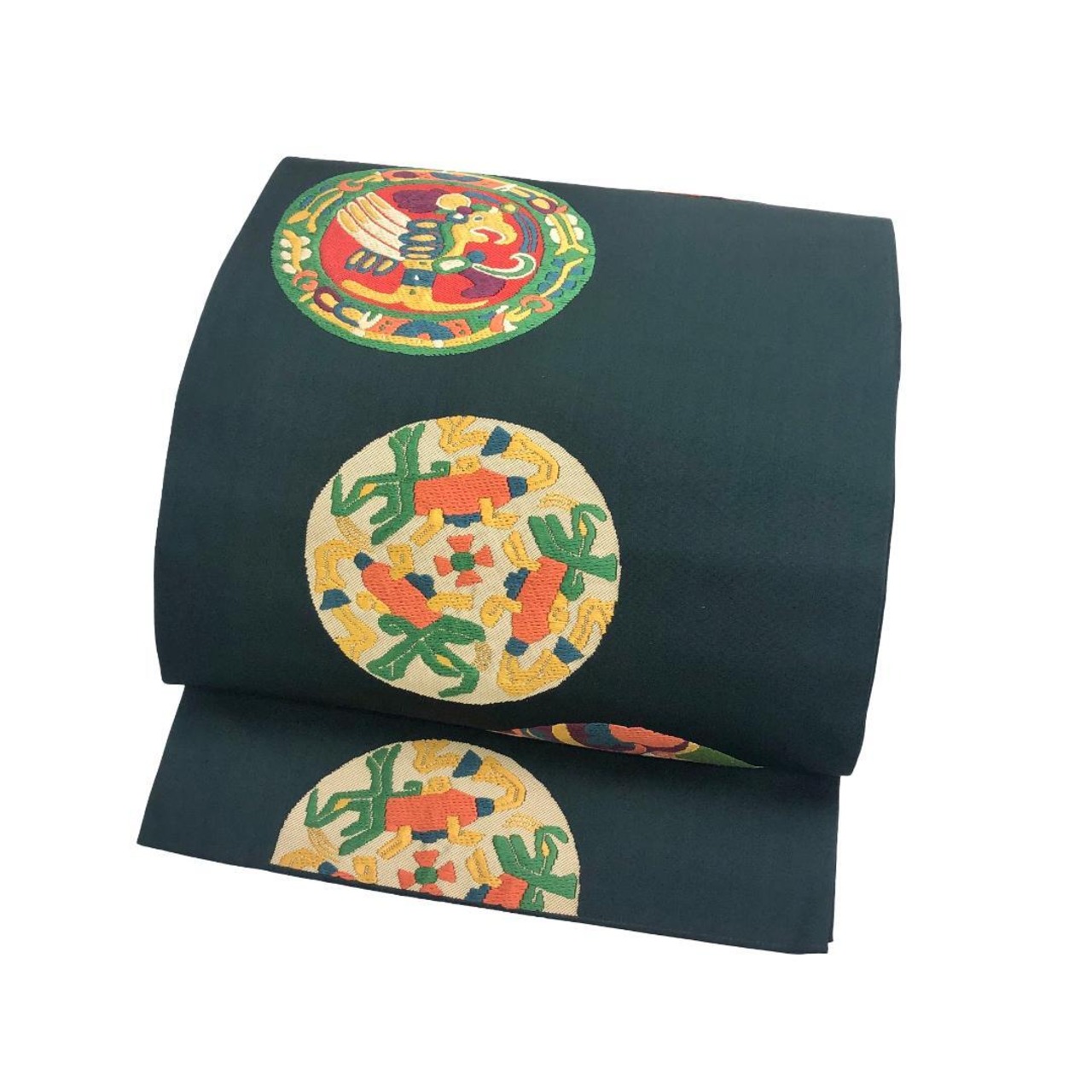 海松藍色の落ち着いたお色味に丸に抽象動物模様の柄裄がデザインされた素敵なお品でございます。