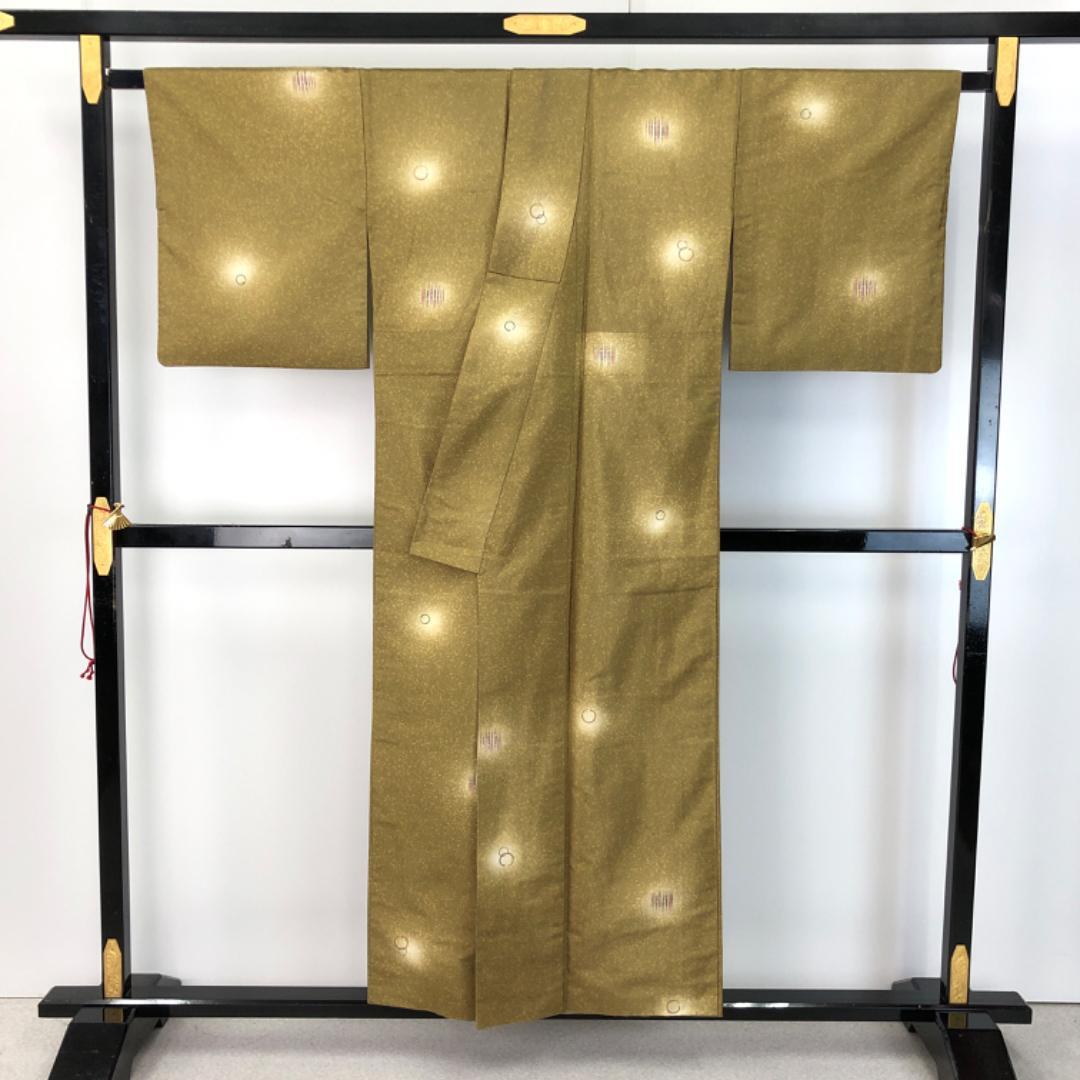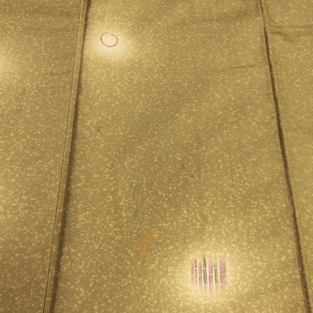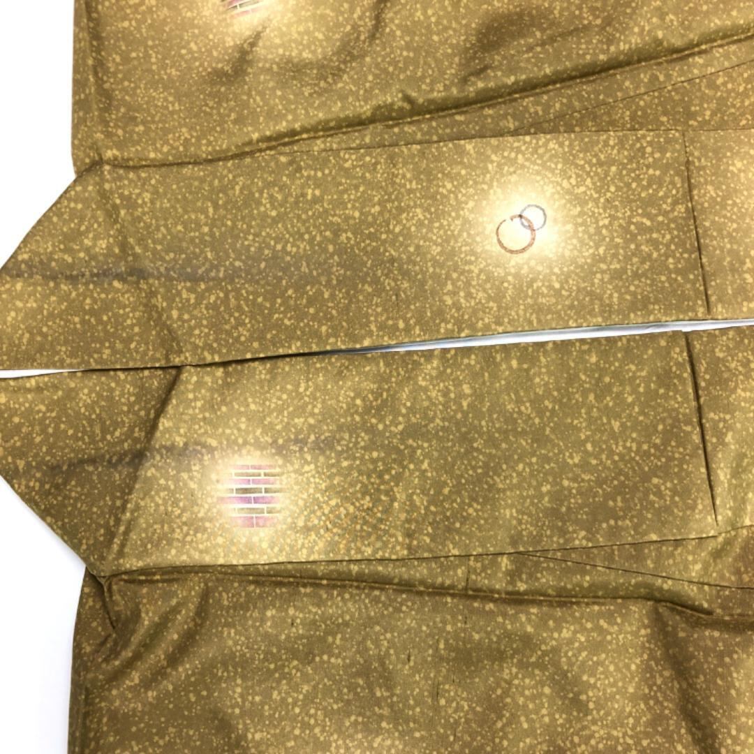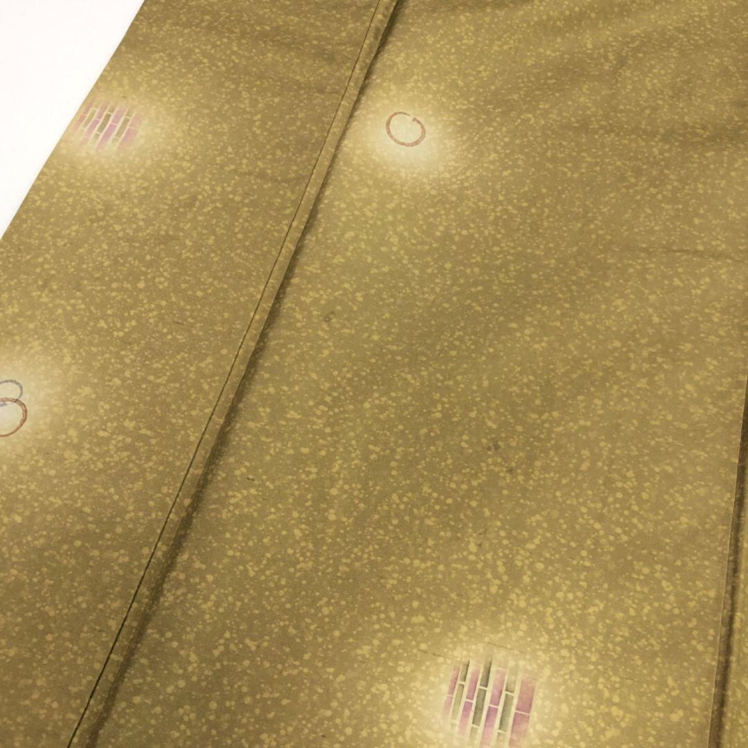 梅谷渋色のお色味に暈し、叩き染、丸や竹の柄行がデザインされた素敵な柄裄のお品でございます。