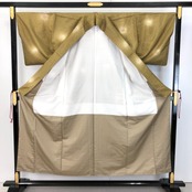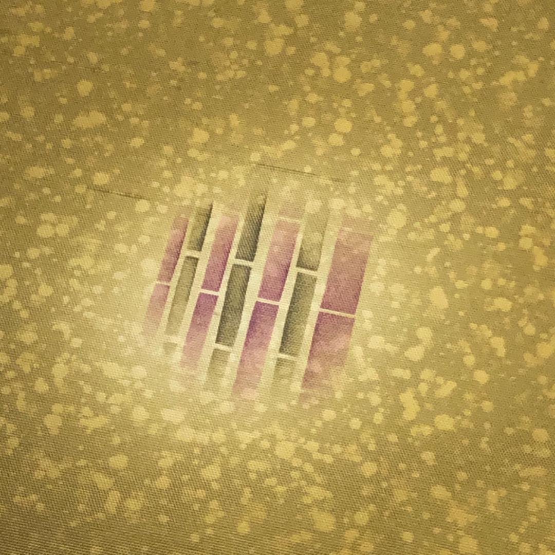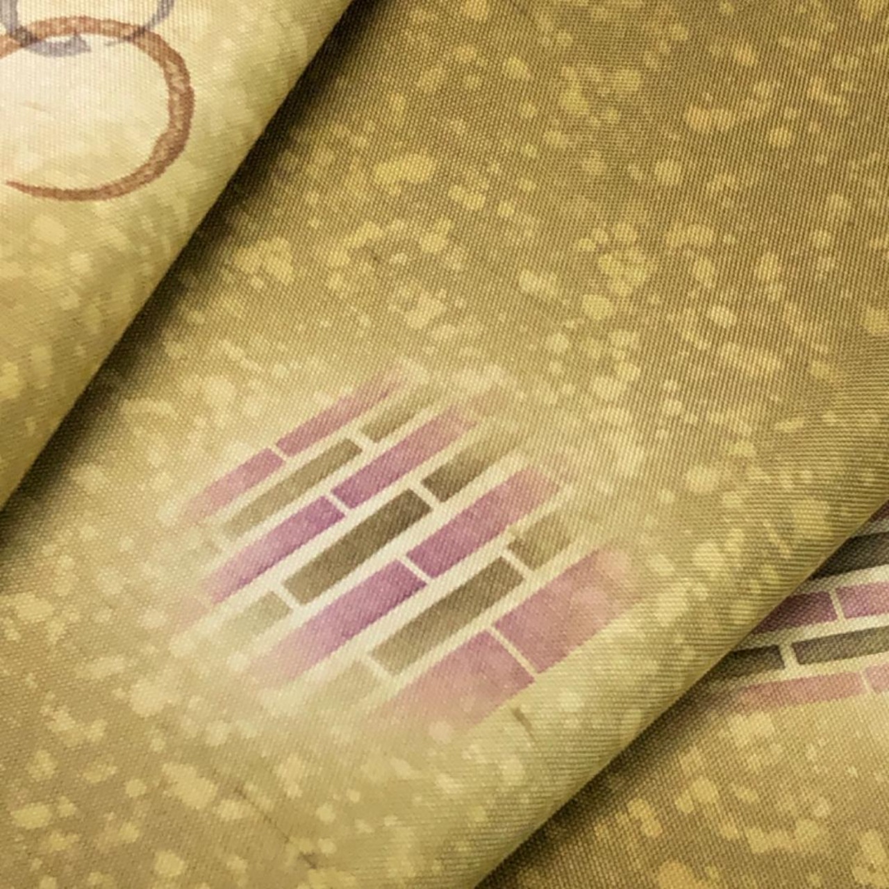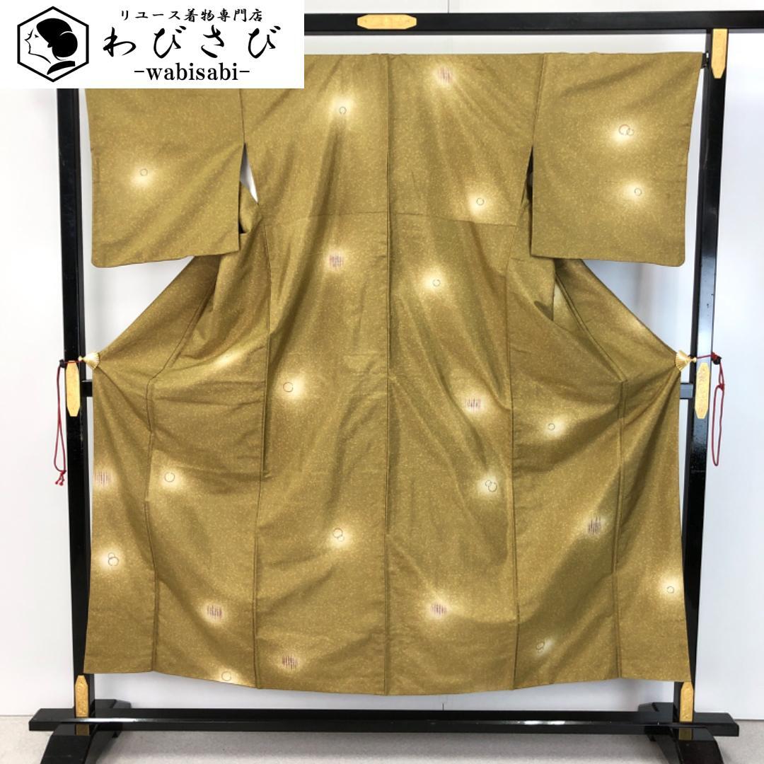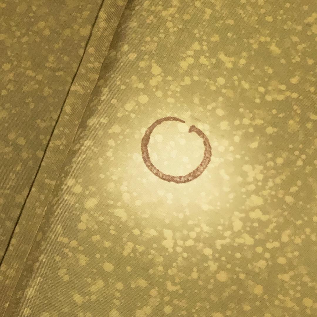 梅谷渋色のお色味に暈し、叩き染、丸や竹の柄行がデザインされた素敵な柄裄のお品でございます。