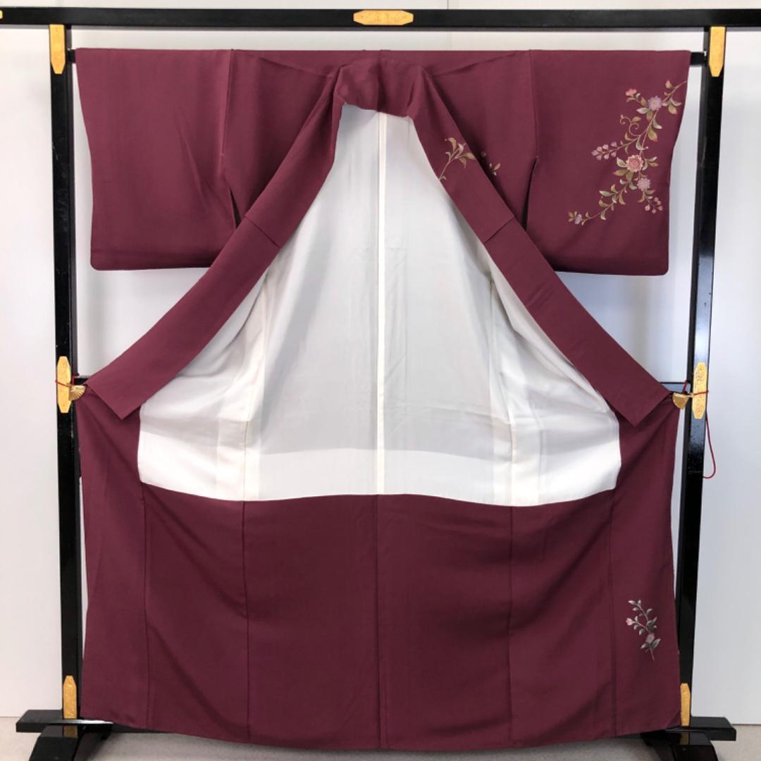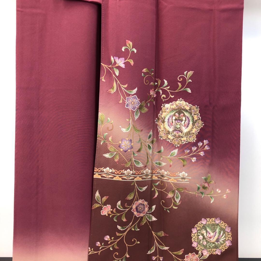 赤紫色のお色味に暈しに鳳凰、花唐草模様の柄裄がデザインされた素敵なお品でございます。