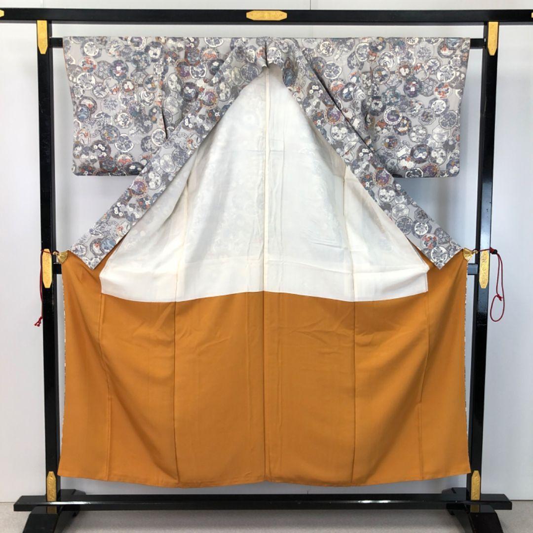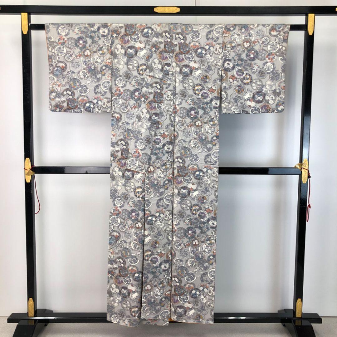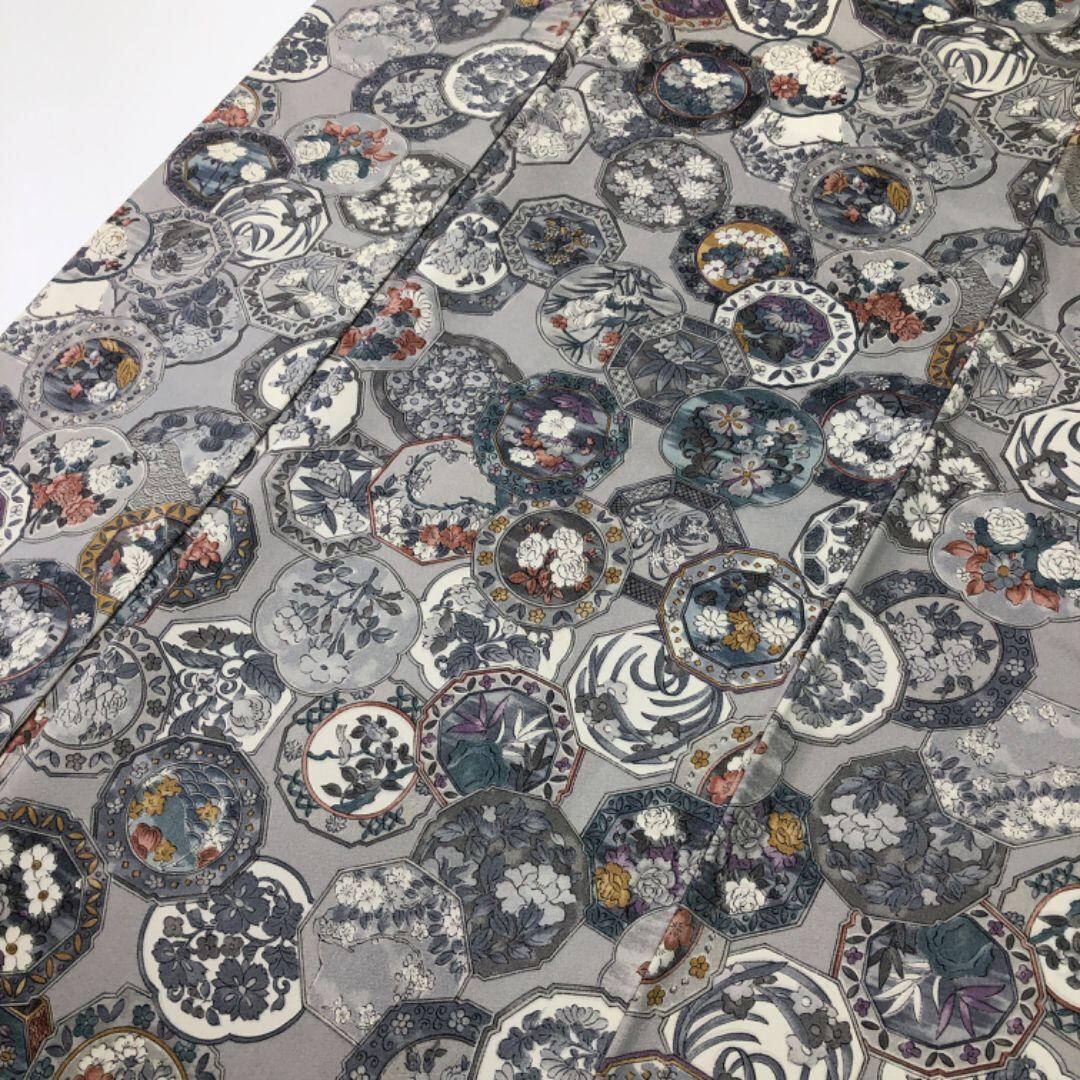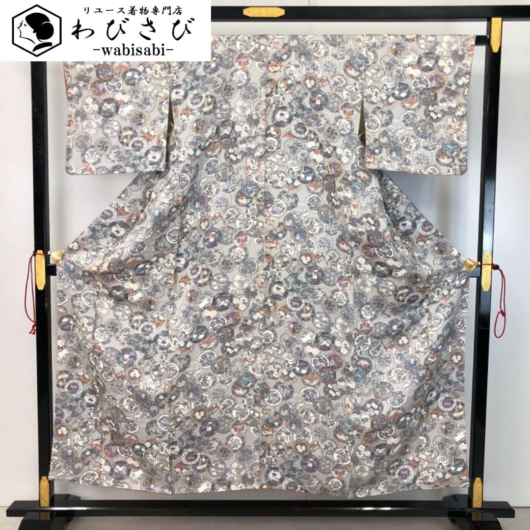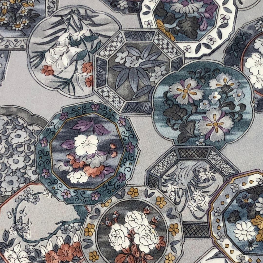 白鼠色のお色味に鏡に花模様の柄裄がデザインされた素敵なお品でございます。