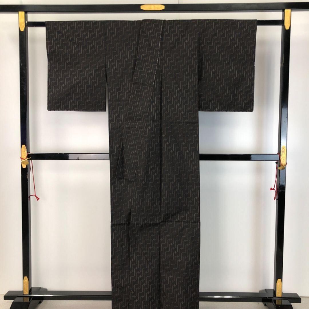 夏着物 紬 抽象寄れ模様 高島屋誂え 涅色 しつけ糸 K-5131 着物 きもの kimono 和服 和装 中古 リサイクル着物 【送料無料】