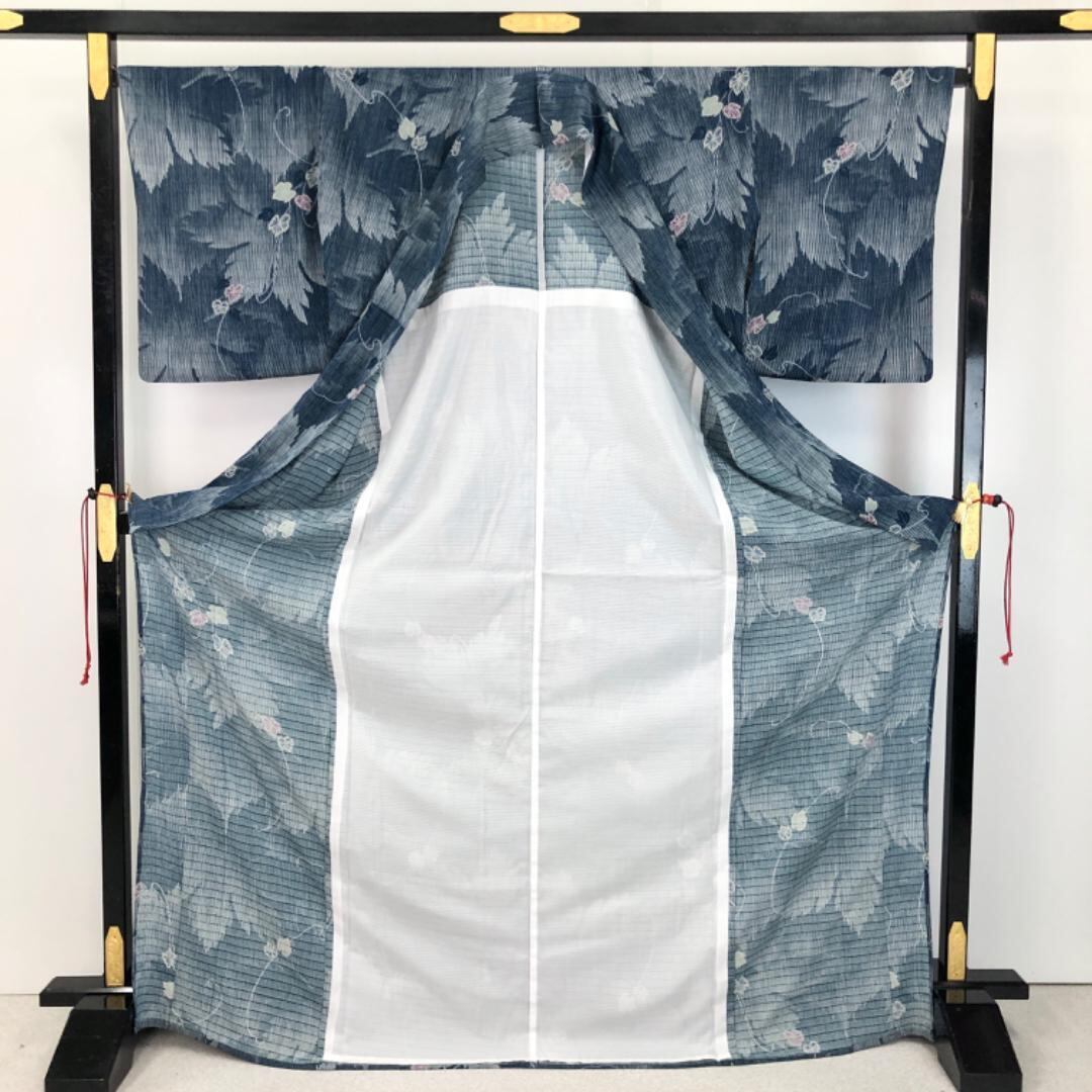 青藍色のお色味に蔦葉模様の柄裄がデザインされた素敵なお品でございます。