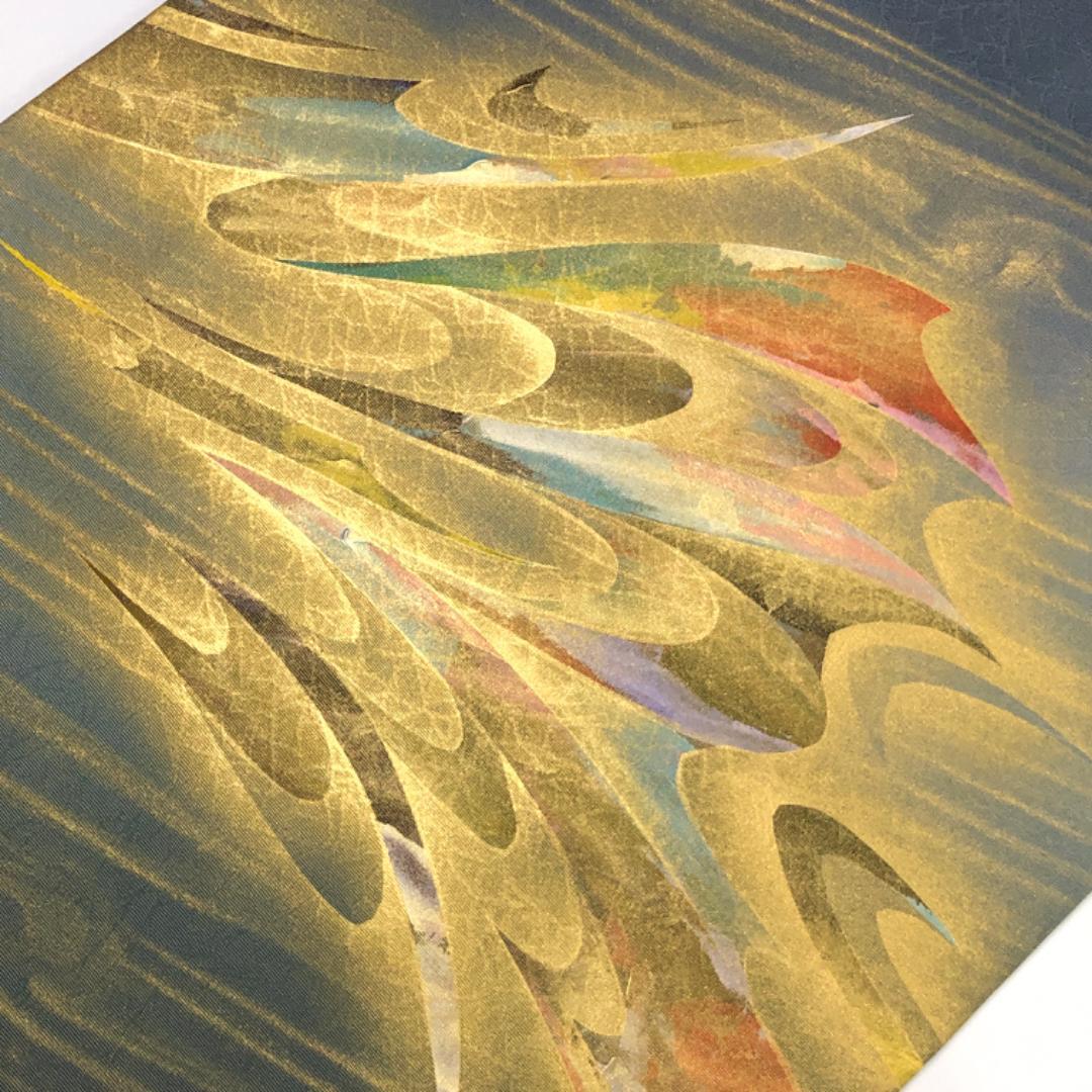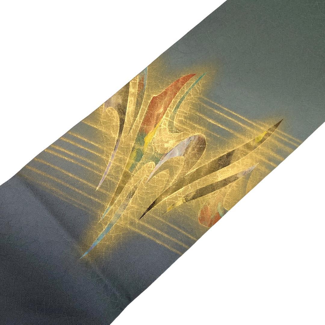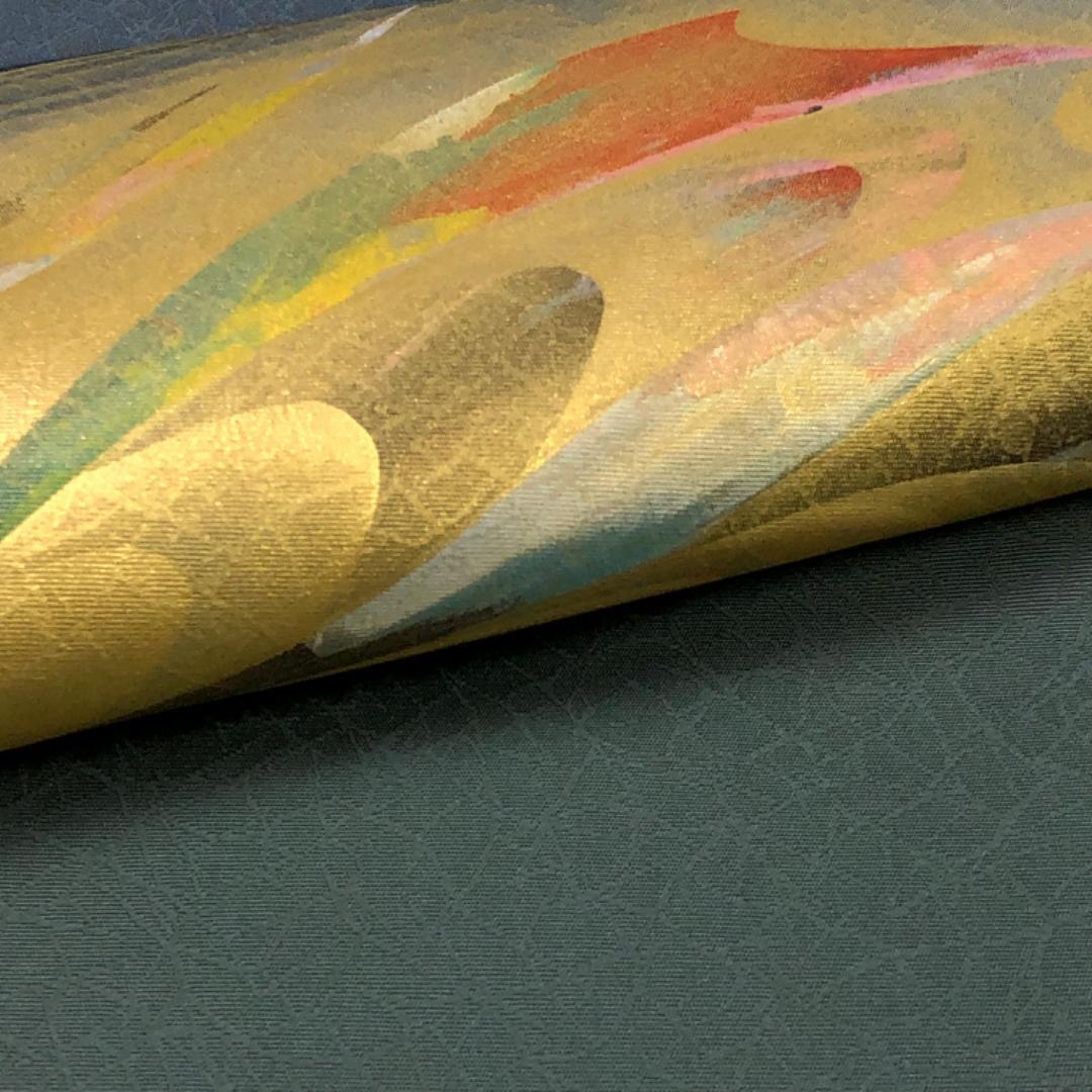 薄鈍色の落ち着きのあるお色味の塩瀬に美しい金彩が使われた抽象模様がデザインされた素敵な柄裄のお品でございます。