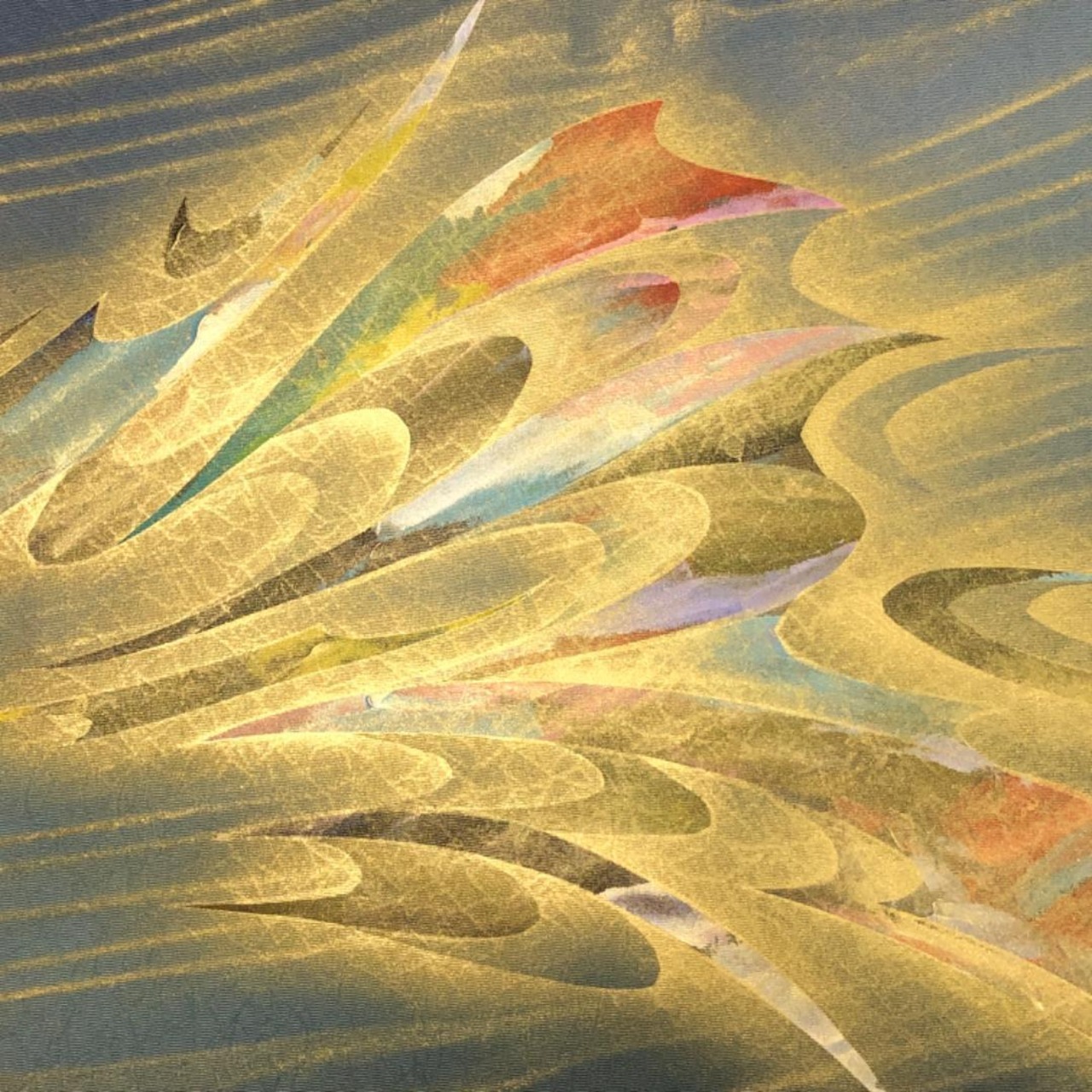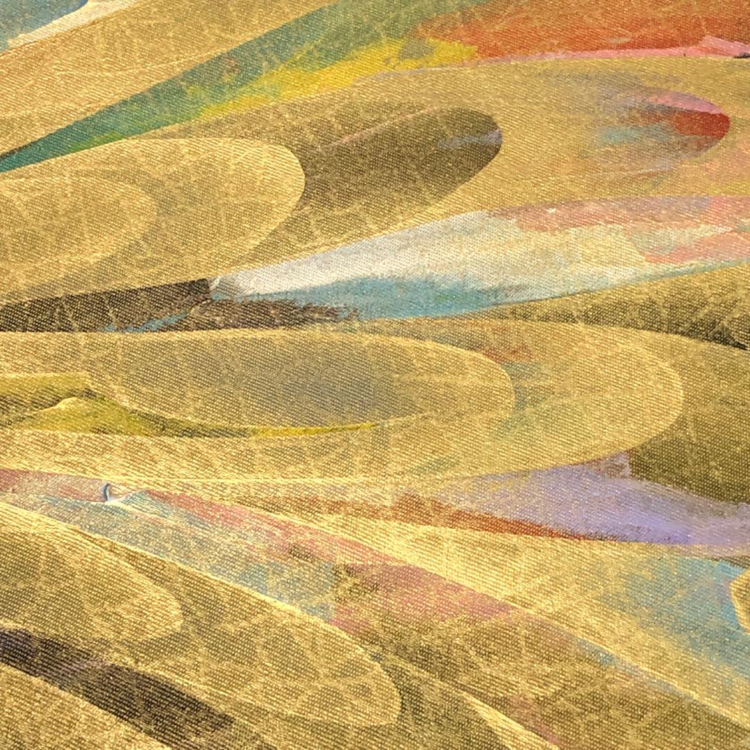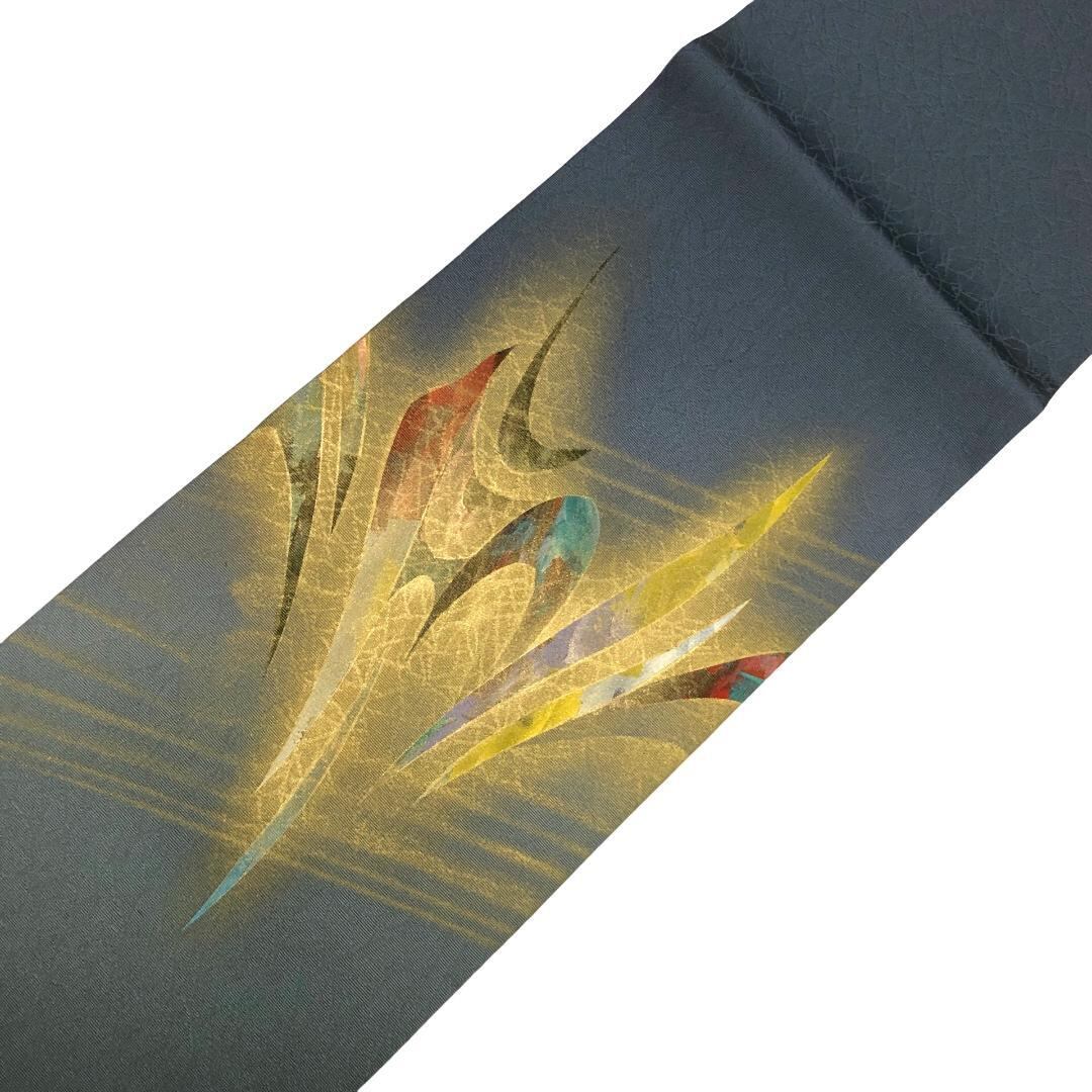 薄鈍色の落ち着きのあるお色味の塩瀬に美しい金彩が使われた抽象模様がデザインされた素敵な柄裄のお品でございます。