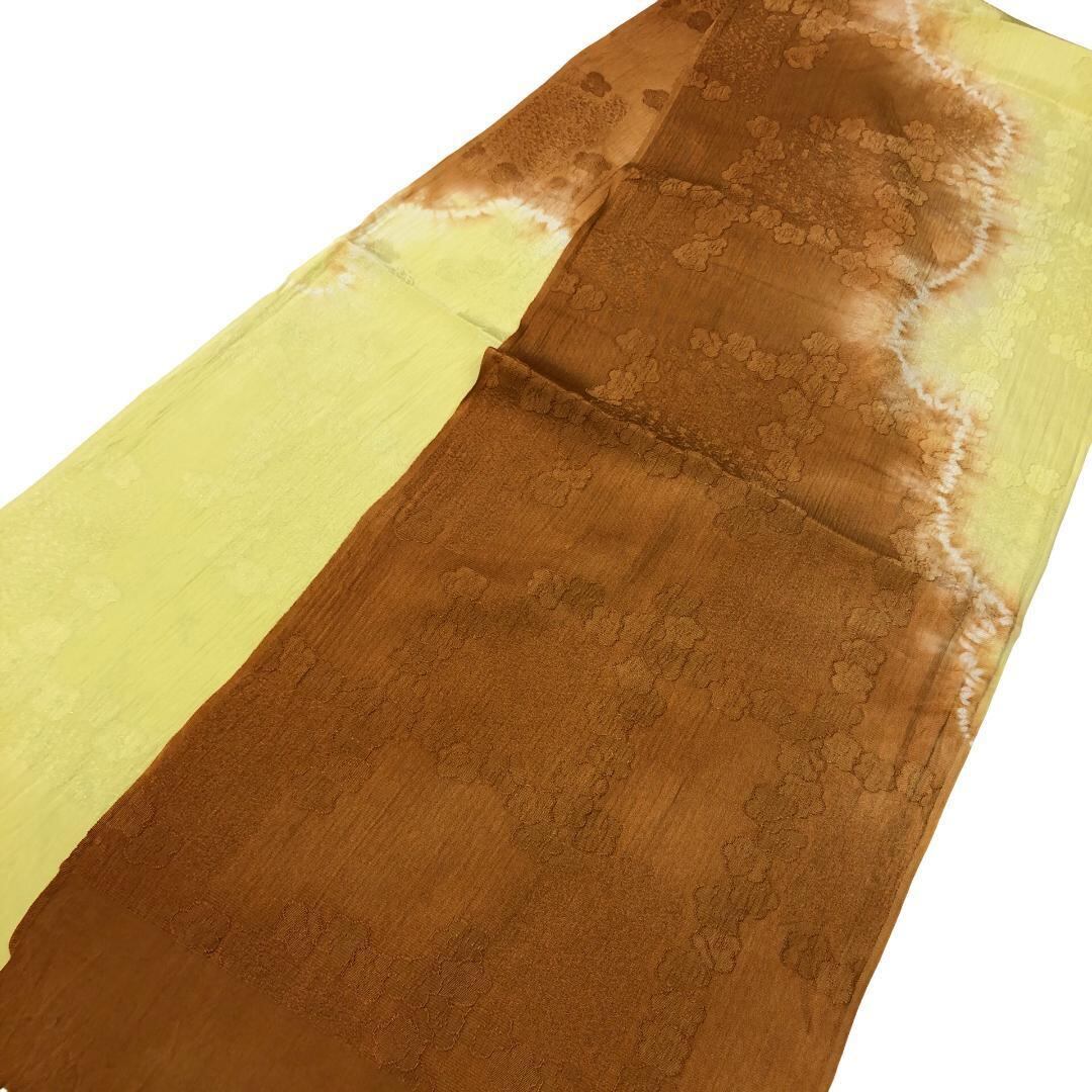 茶色と薄黄蘗色の染分けのお色味に花模様の柄裄がデザインされた素敵なお品でございます。