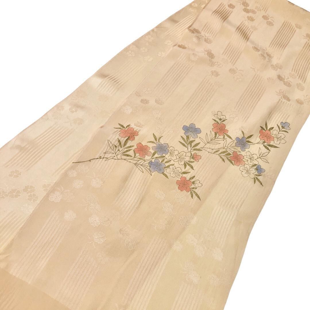 薄柑子色のお色味に花模様の柄裄がデザインされた素敵なお品でございます。