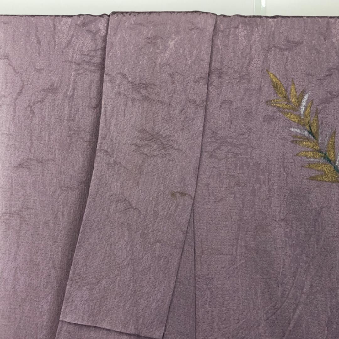 鳩羽色ベースのお色味、輝染、絞り染、華柄に葉模様がデザインされた雰囲気の良い素敵な柄裄のお品でございます。