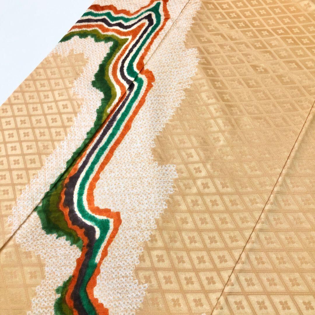 麦藁色のお色味に花菱模様、絞りの抽象模様がデザインされた素敵なお品でございます。