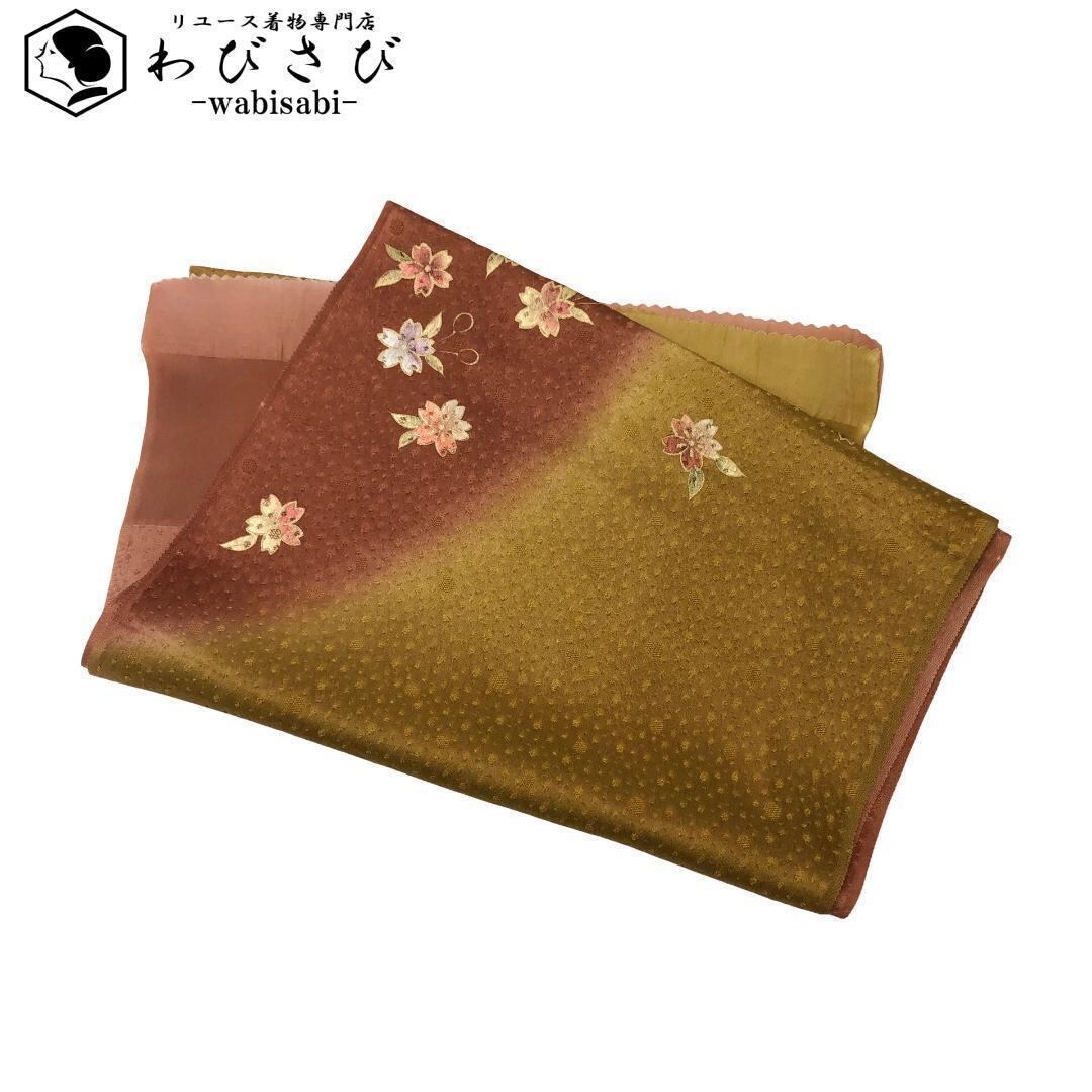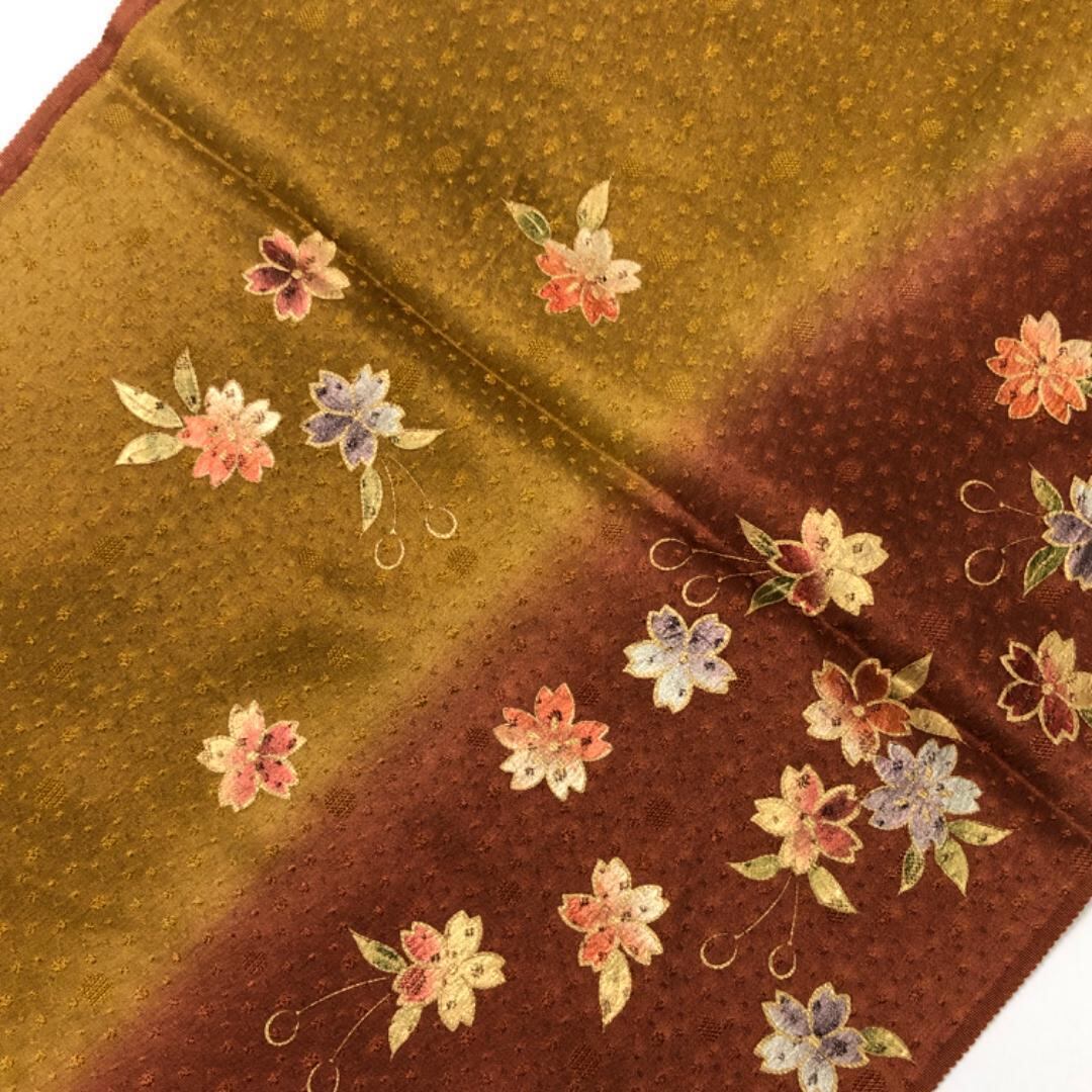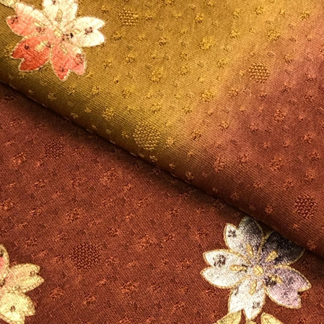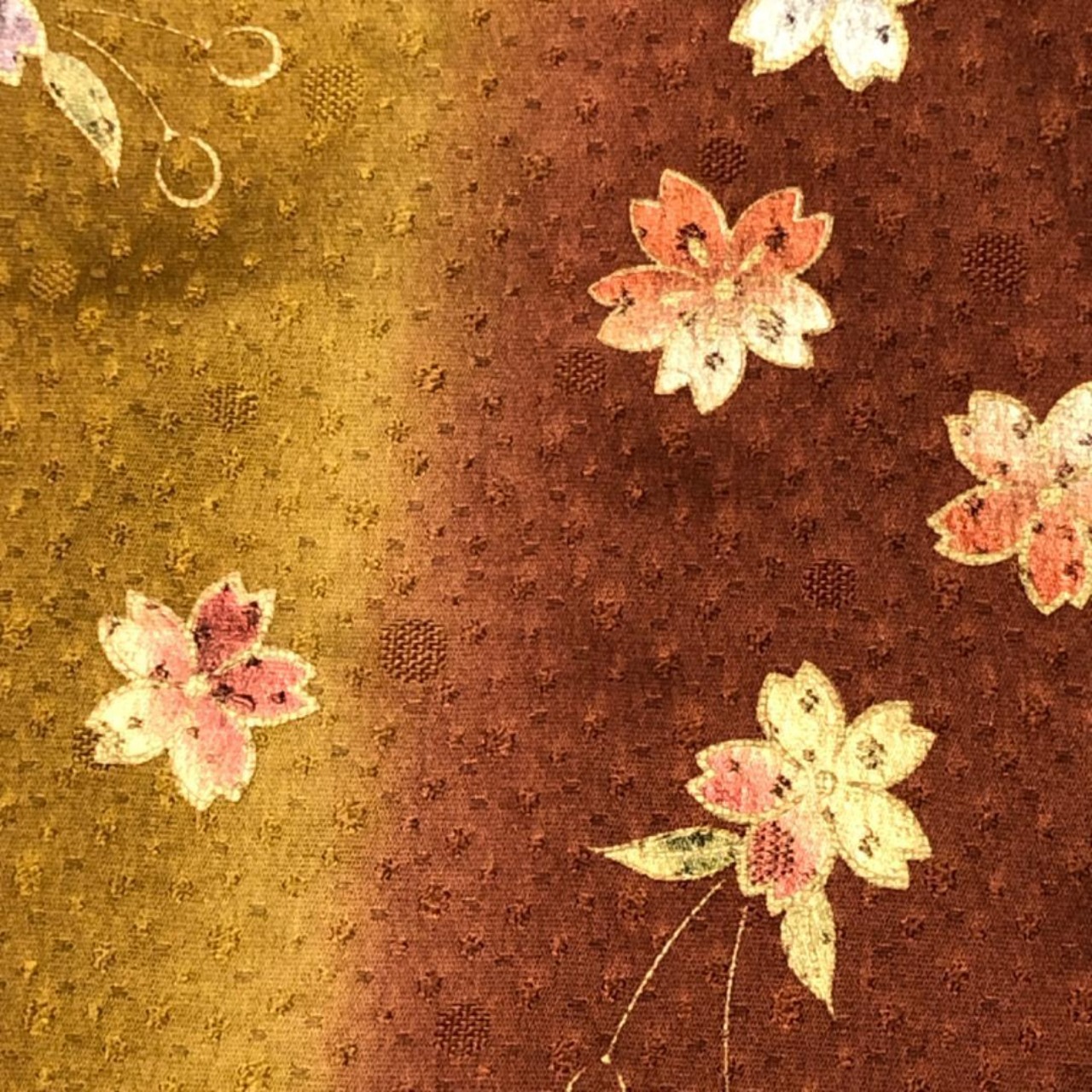 黄唐茶色の染分けのお色味に花模様の柄裄がデザインされた素敵なお品でございます。