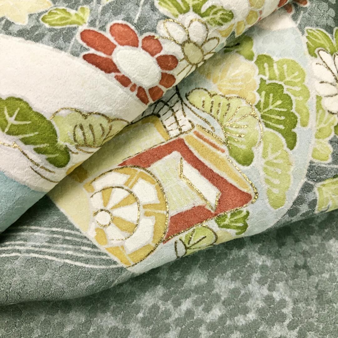 裏葉色のお色味に扇子に御所車、花模様の柄裄がデザインされた素敵なお品でございます。