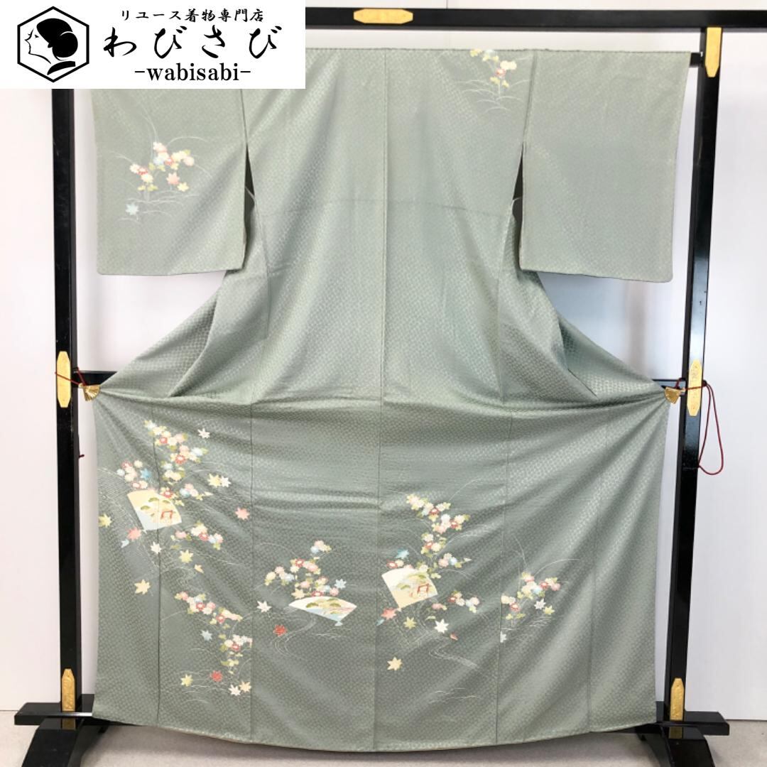 付下げ 扇子に御所車 花模様 裏葉色 金彩 トールサイズ K-5057 着物 きもの kimono 和服 和装 中古 リサイクル着物 【送料無料】